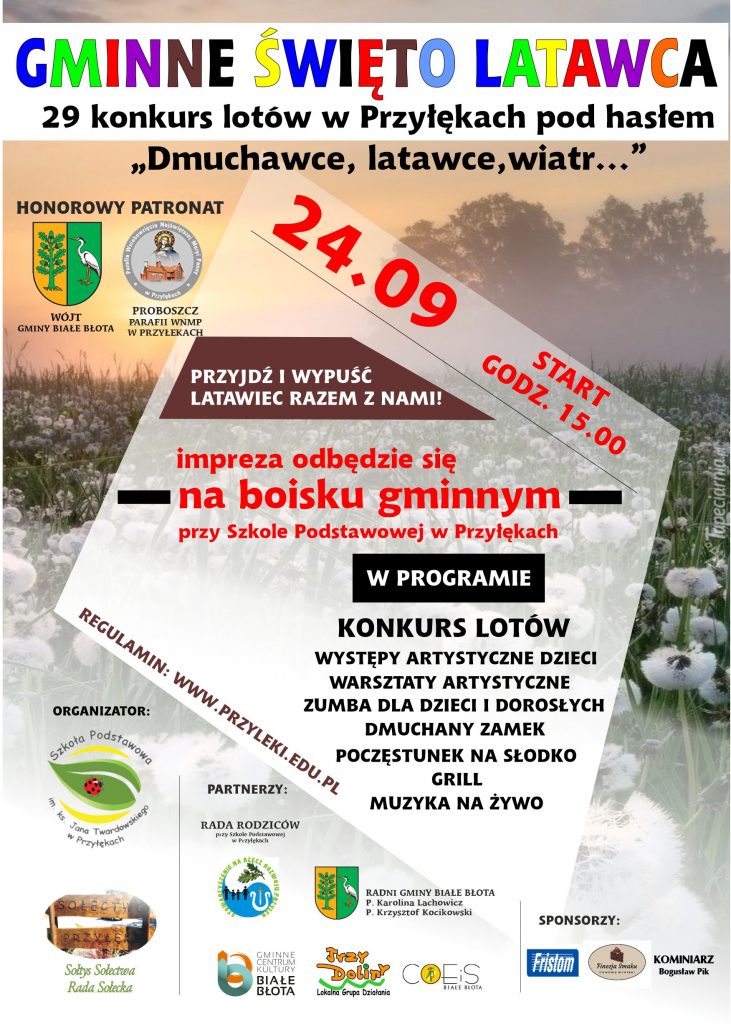 Szkoła Podstawowa im. ks. Jana Twardowskiego w Przyłękach serdecznie zaprasza uczniów Szkół Podstawowych z terenu Gminy Białe Błota do udziału w GMINNYM ŚWIĘCIE LATAWCA, które odbędzie się 24 września 2022 r. o godz. 15.00