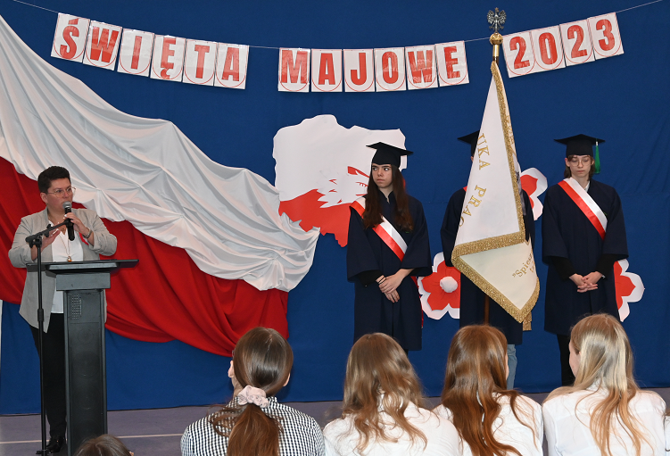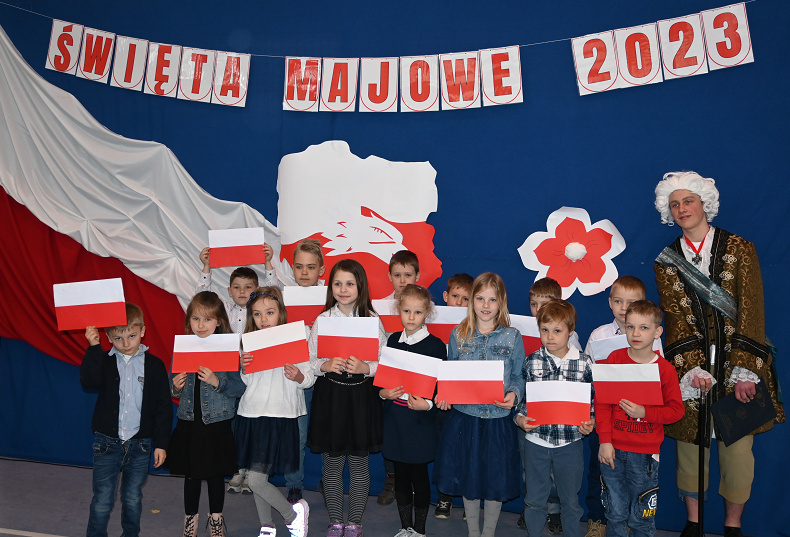Obchody rozpoczęliśmy odśpiewaniem hymnu państwowego, a w część artystyczną aktorzy weszli w takt “Poloneza 3 Maja”. Na scenie i wśród publiczności dominowały barwy biało-czerwone, ponieważ uczciliśmy również Święto Flagi. Nie zabrakło pieśni “Witaj, majowa jutrzenko”, która dopełniła obchody majowych świąt. Uroczystość zakończyliśmy tańcem patriotycznym i piosenką “Flaga”.