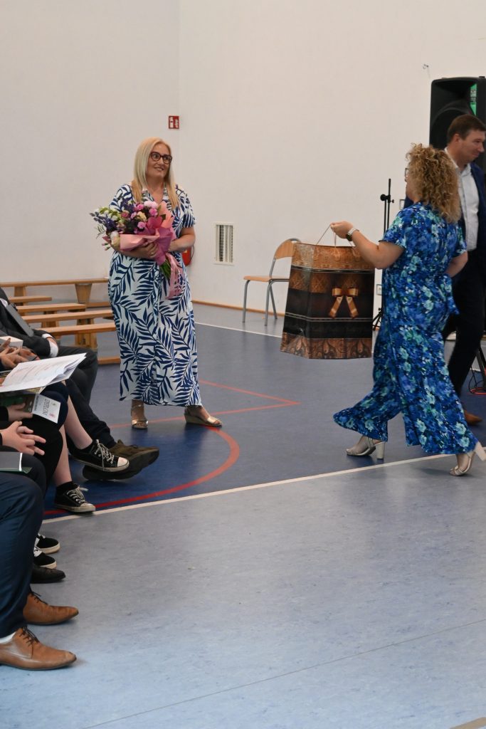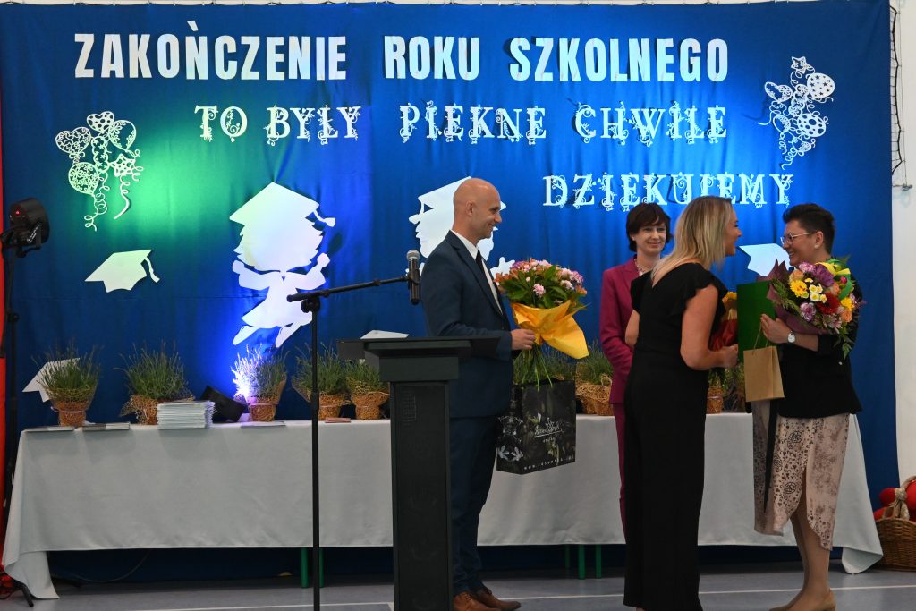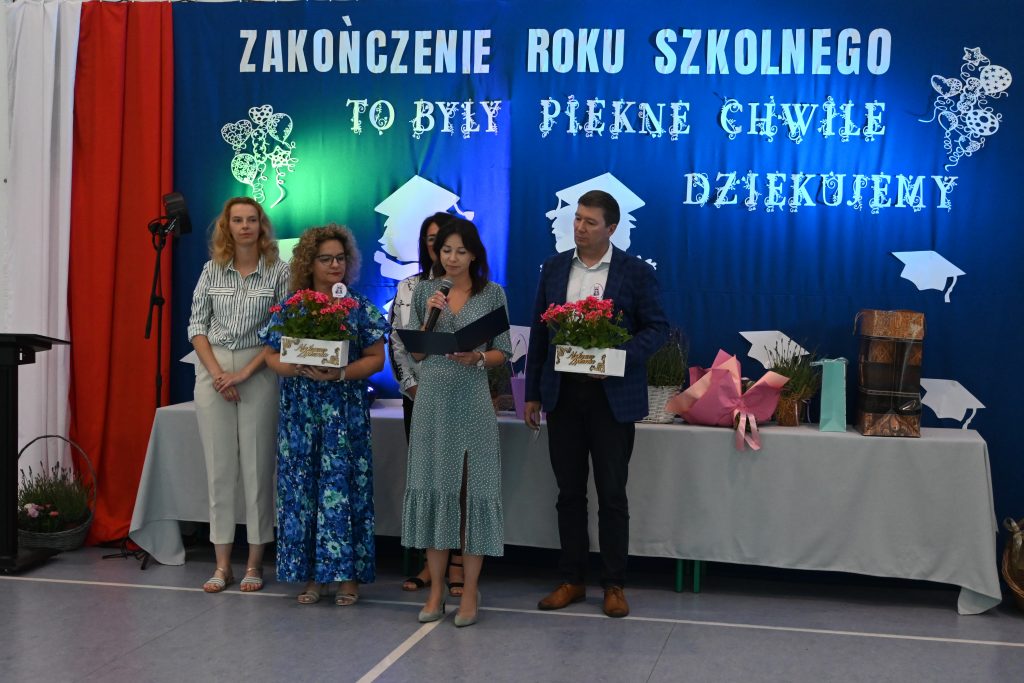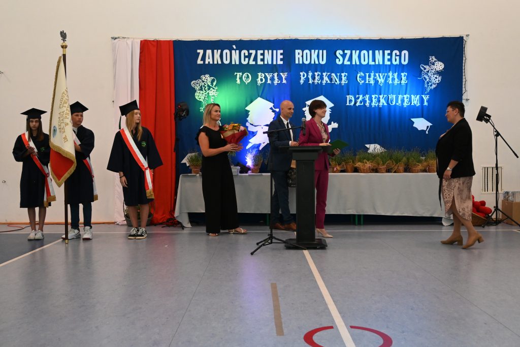 Pani Wójt Magdalena Maison wraz z Radną Karoliną Lachowicz i Kierownikiem Centrum Obsługi Edukacji i Sportu Patrycjuszem Migawą podziękowali pani dyrektor Karolinie Pasiecznej- Szpuleckiej za zaangażowanie i wkład pracy włożony w rozwój kierowanej przez nią szkoły.