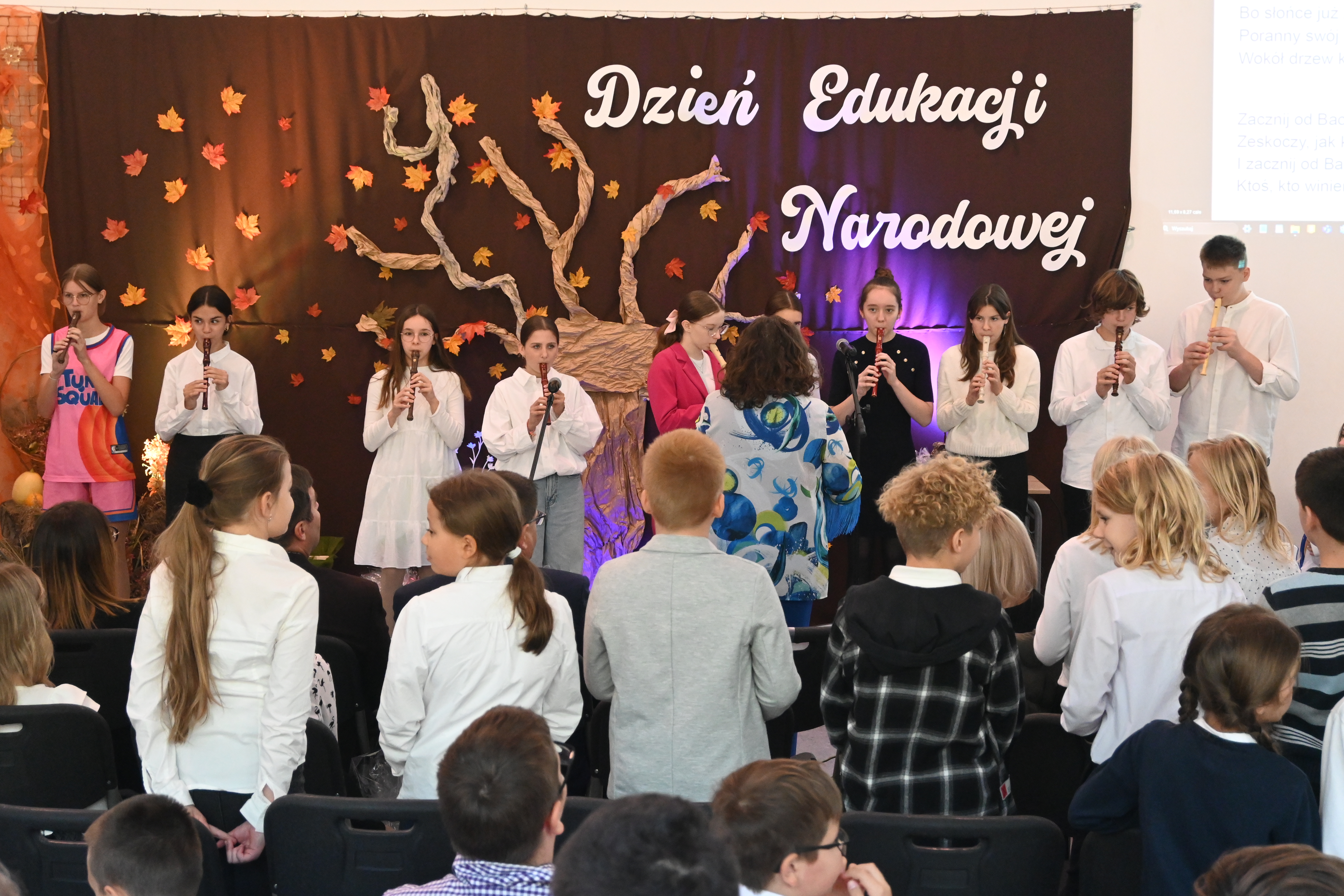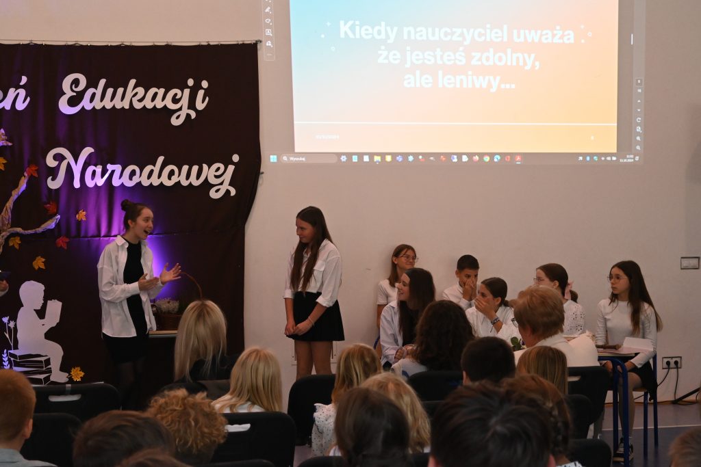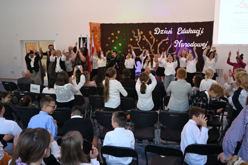 W muzycznym akcencie zaprezentowali się uczniowie klasy 3a i 3b, którzy wraz z wychowawcami, Sylwią Żołną i Izabelą Ostrowską, przygotowali taniec oraz zaśpiewali piosenkę wyrażającą wdzięczność dla nauczycieli i pracowników szkoły za cierpliwość, ciepłe słowo i trud codziennej pracy. Śpiewająco zaprezentowały się również Lena Kasprzyk i Maja Brudnoch z klasy 7a.