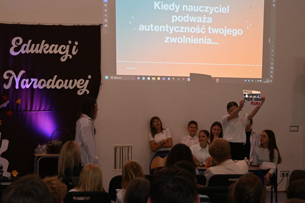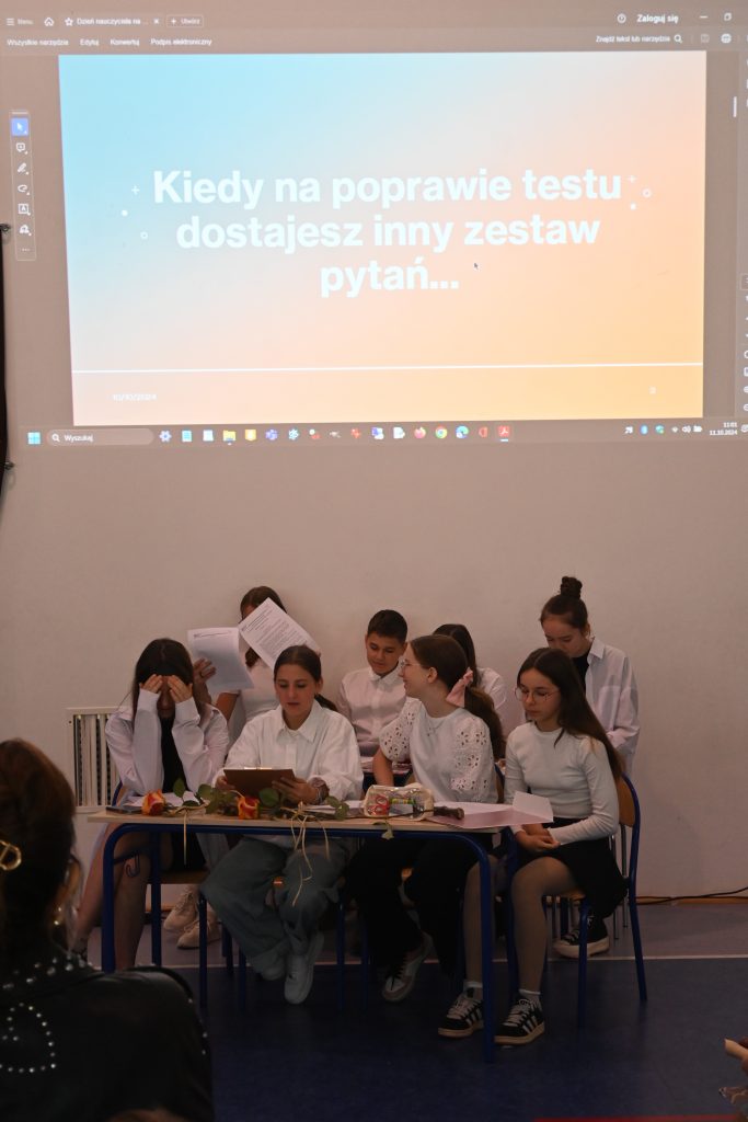 Uśmiechy i żarty towarzyszyły zgormadzonej społeczności w drugiej części uroczystości, podczas której uczniowie z kołą teatralnego zaprezentowali pokaz mody i “rodzaje” nauczycieli, któych mają okazję spotkać w trakcie edukacji, a także przedstawili scenki z życia szkolnego.
