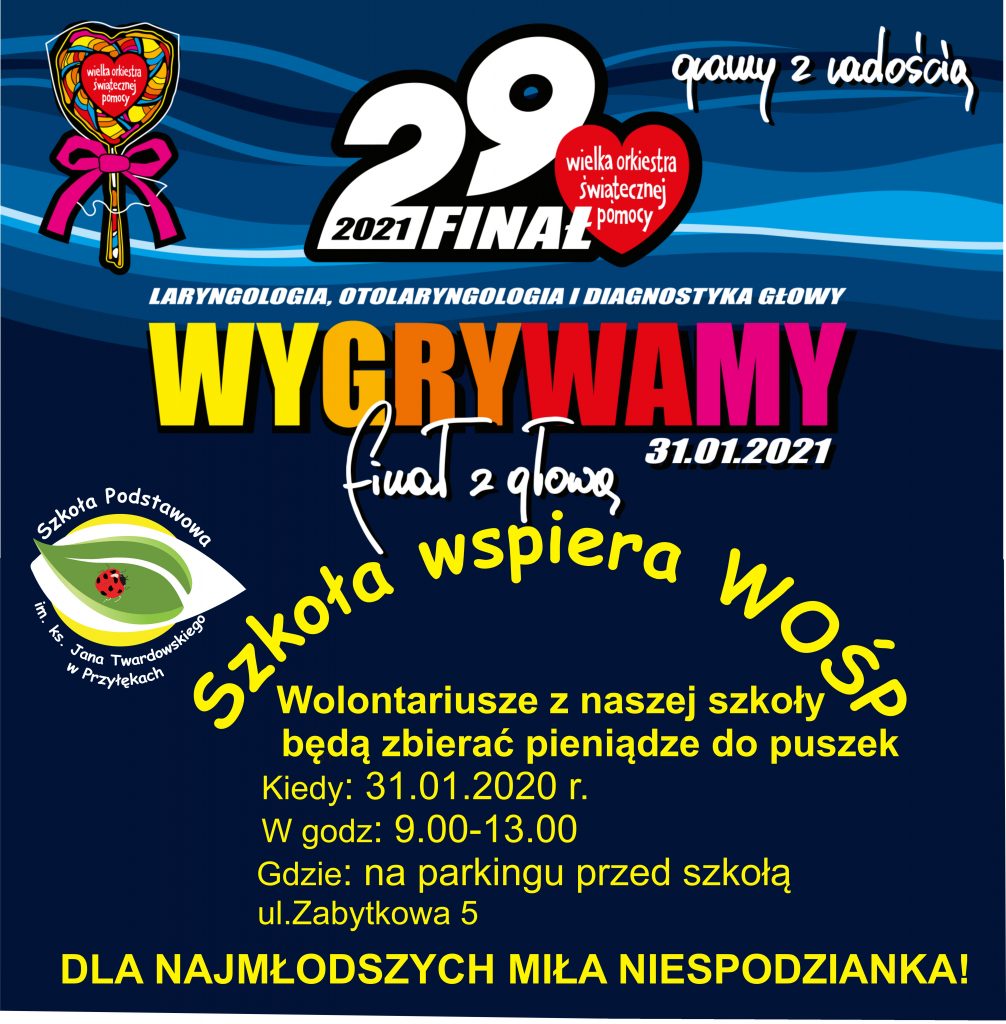 Jak co roku uczniowie naszej szkoły włączają się w akcję Wielkiej Orkiestry Świątecznej Pomocy. Niestety ze względu na ograniczenia związane z epidemią Coronavirusa nie możemy kwestować w takiej formie jak w poprzednich latach. Jednak Wolontariusze z naszej szkoły będą zbierać pieniądze do puszek w pobliżu szkoły, 31.01.2021 r. w godzinach 9.00-13.00. Liczymy na Wasze wsparcie, otwórzcie serca i pokażcie, że na mieszkańców Przyłęk zawsze można liczyć. Dla najmłodszych przygotowaliśmy miłą niespodziankę.