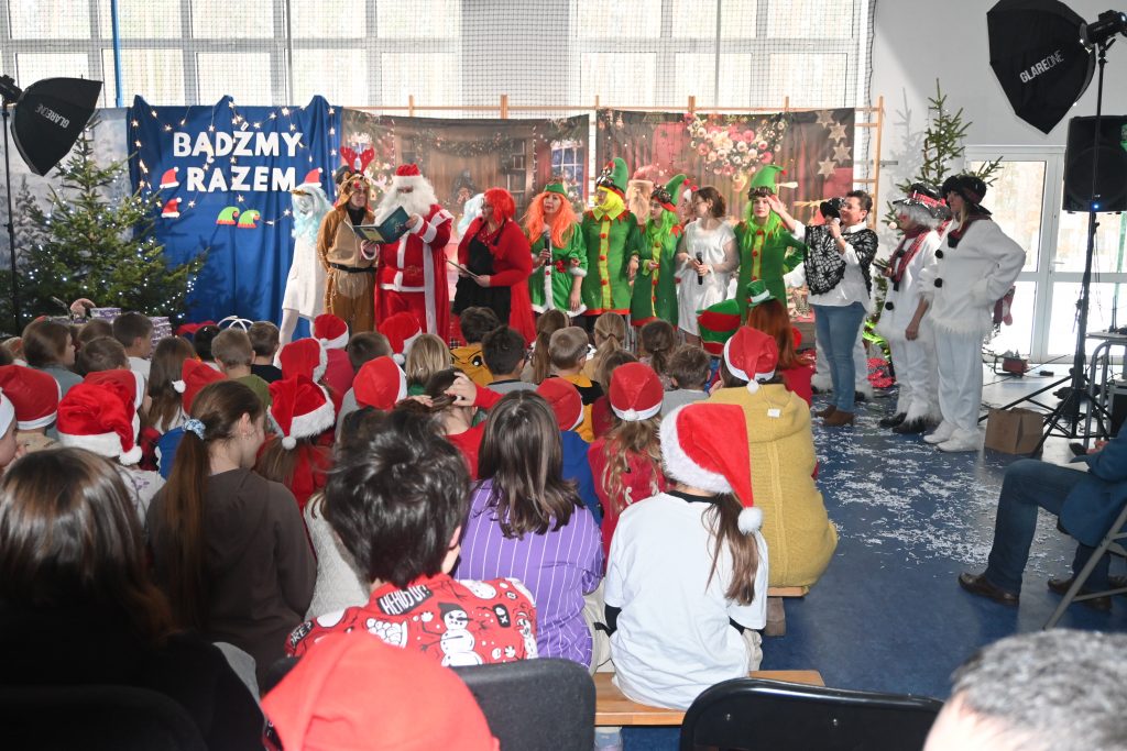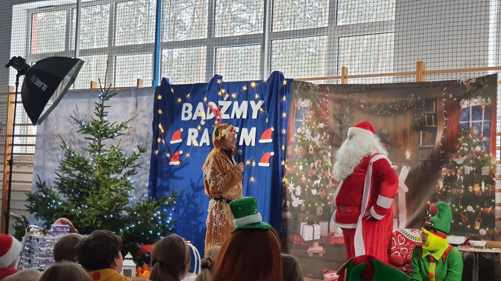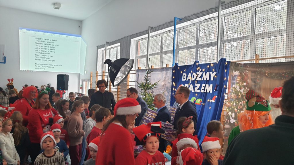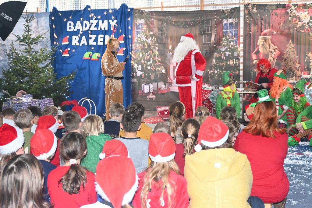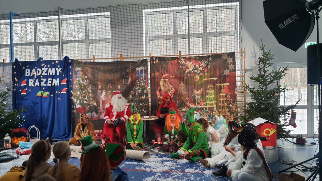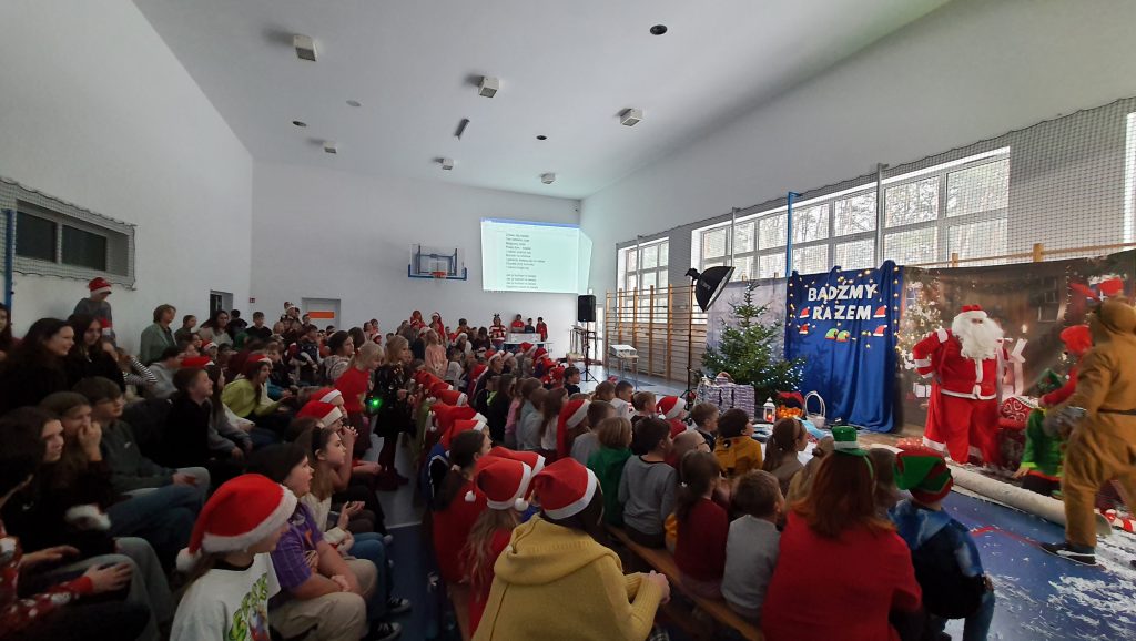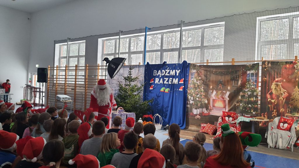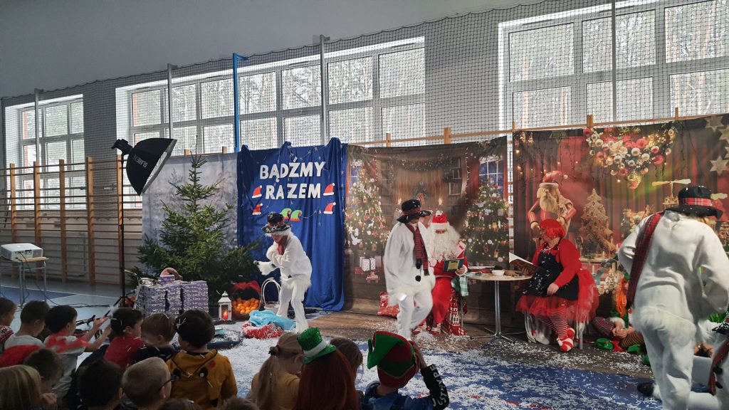 W naszej szkole dokładnie tego dnia bo 6 grudnia, tradycyjnie odbyło się mikołajkowe spotkanie pod hasłem „Bądźmy razem” na które zaproszono całą społeczność szkoły. W scenerii świątecznej z mnóstwem wielokolorowych rozświetlonych światełek, dekoracji i choinek, pani dyrektor Karolina Pasieczna-Szpulecka powitała przybyłych z tej okazji gości: Wójta Gminy Białe Błota Dariusza Fundatora, Wicewójta Pawła Zhuelke, Sołtysa Piotra Mikołaczaka, księdza Proboszcza Zdzisława Lahuttę oraz Kierownika Centrum Obsługi Edukacji i Sportu w Białych Błotach Patrycjusza Migawę, a także zgromadzonych nauczycieli, pracowników i uczniów.
