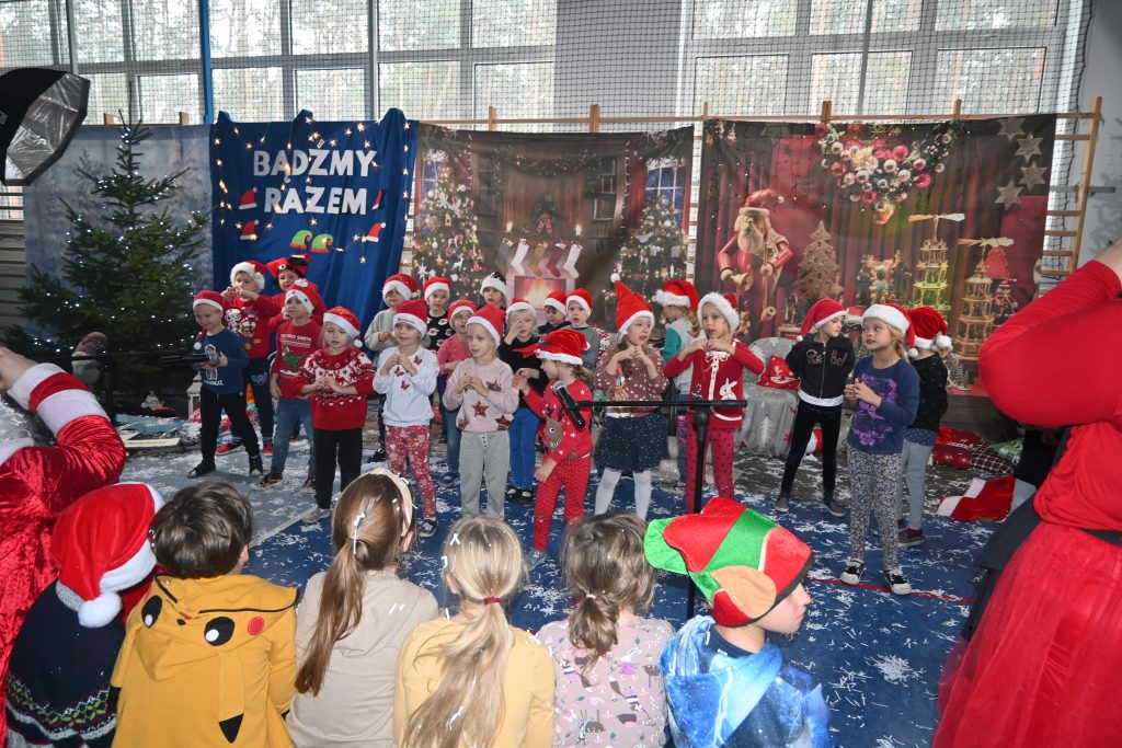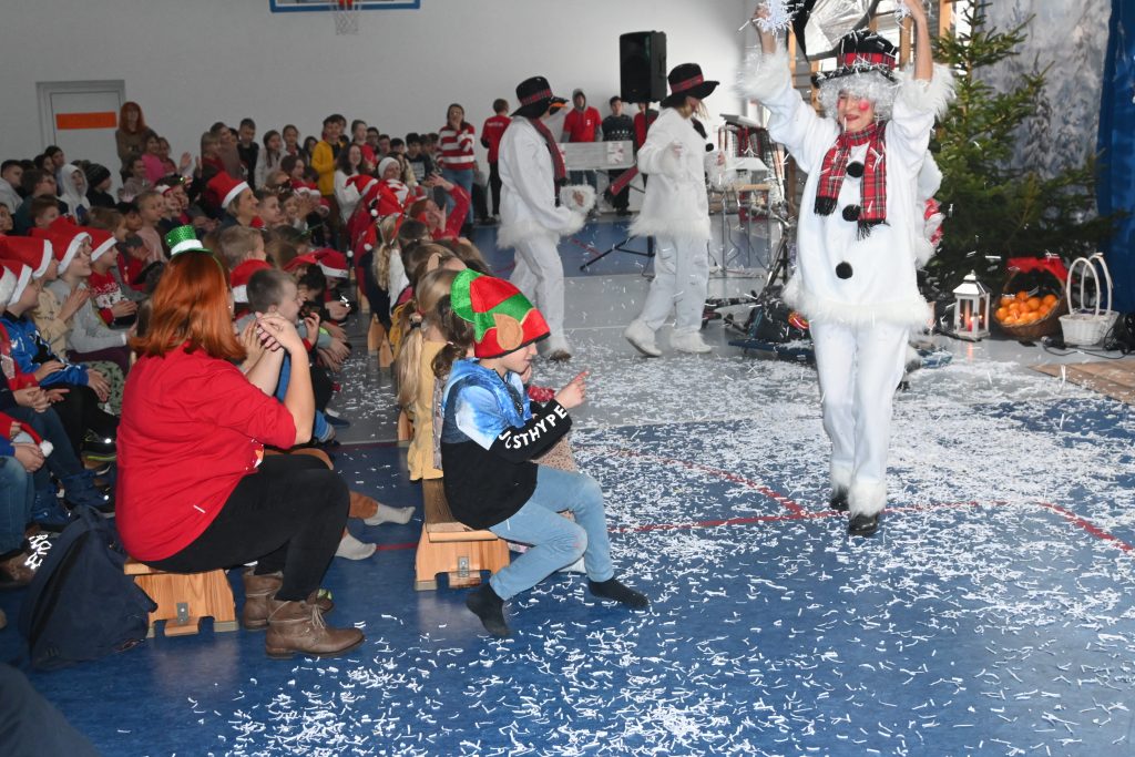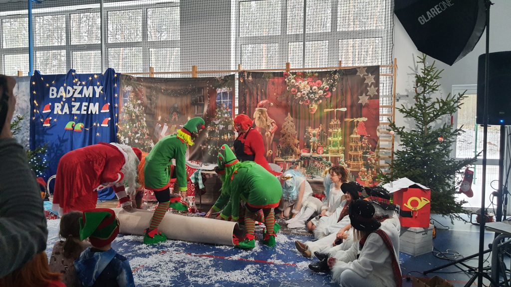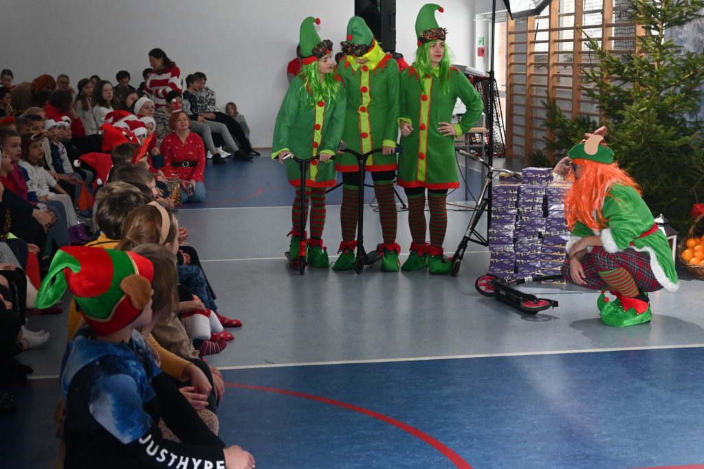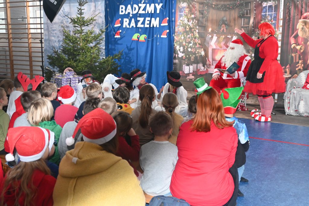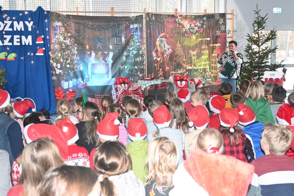 W naszej szkole dokładnie tego dnia bo 6 grudnia, tradycyjnie odbyło się mikołajkowe spotkanie pod hasłem „Bądźmy razem” na które zaproszono całą społeczność szkoły. W scenerii świątecznej z mnóstwem wielokolorowych rozświetlonych światełek, dekoracji i choinek, pani dyrektor Karolina Pasieczna-Szpulecka powitała przybyłych z tej okazji gości: Wójta Gminy Białe Błota Dariusza Fundatora, Wicewójta Pawła Zhuelke, Sołtysa Piotra Mikołaczaka, księdza Proboszcza Zdzisława Lahuttę oraz Kierownika Centrum Obsługi Edukacji i Sportu w Białych Błotach Patrycjusza Migawę, a także zgromadzonych nauczycieli, pracowników i uczniów.