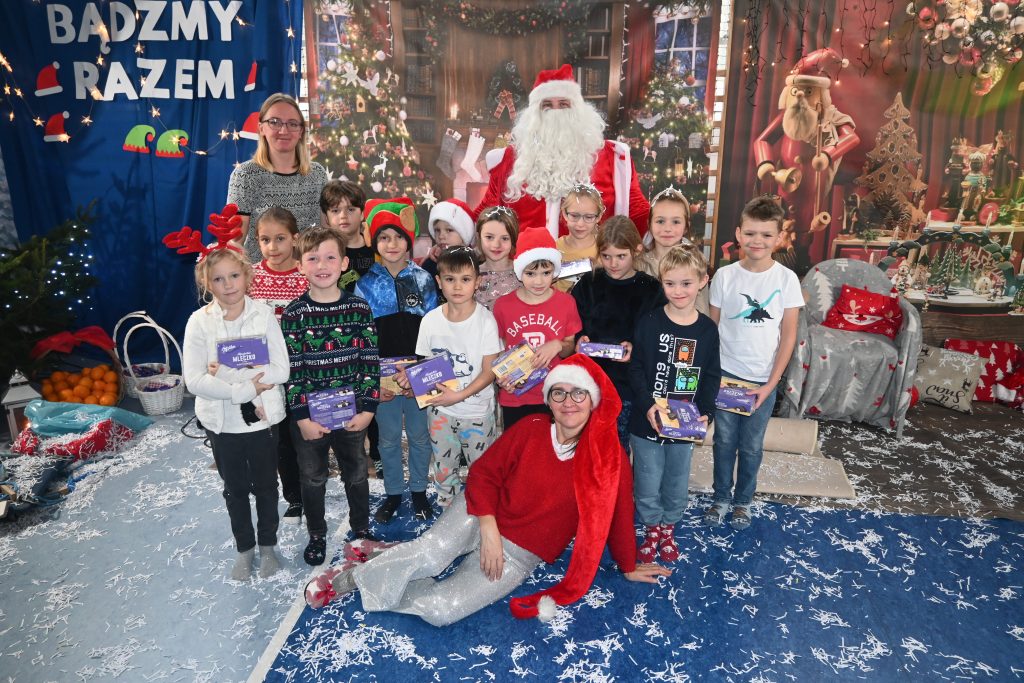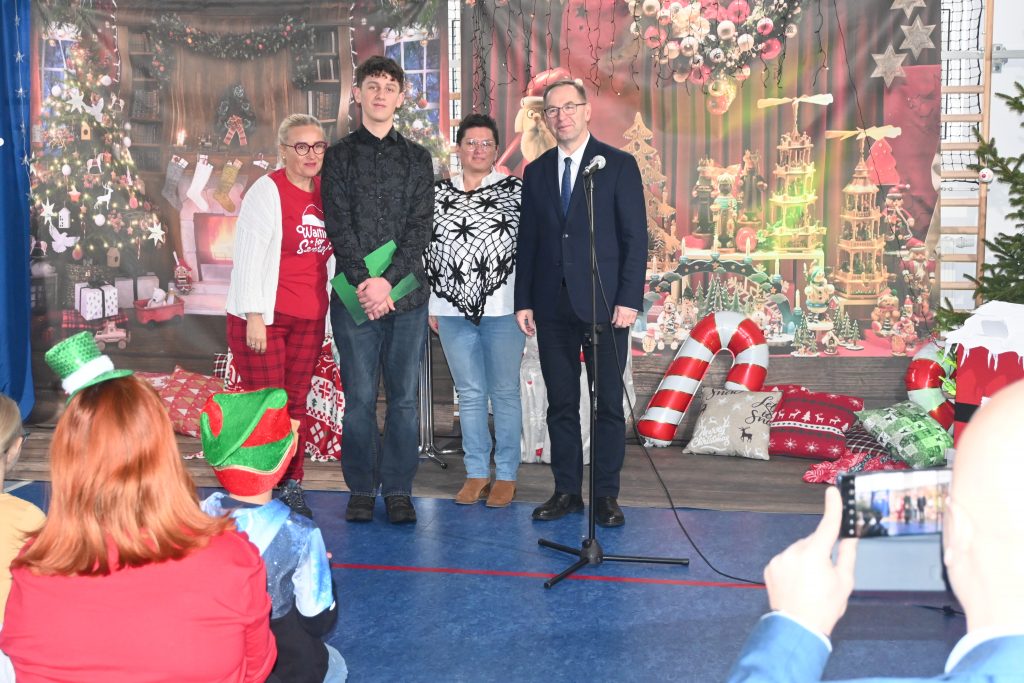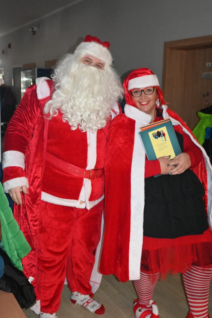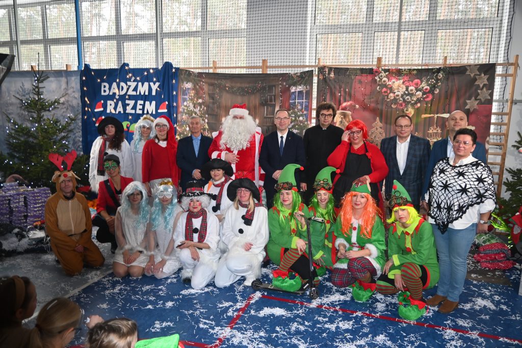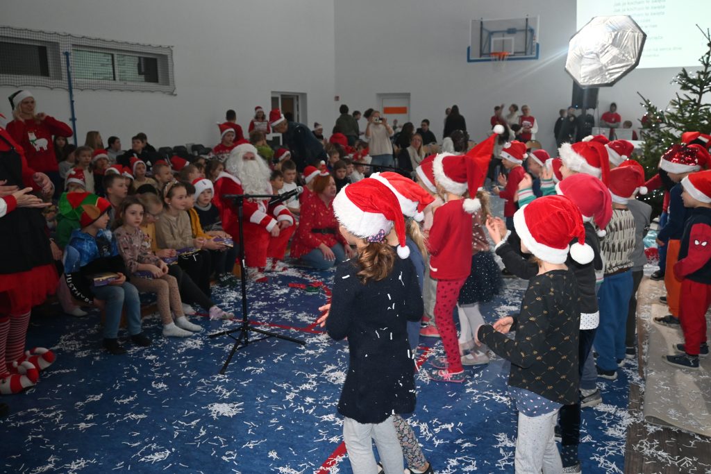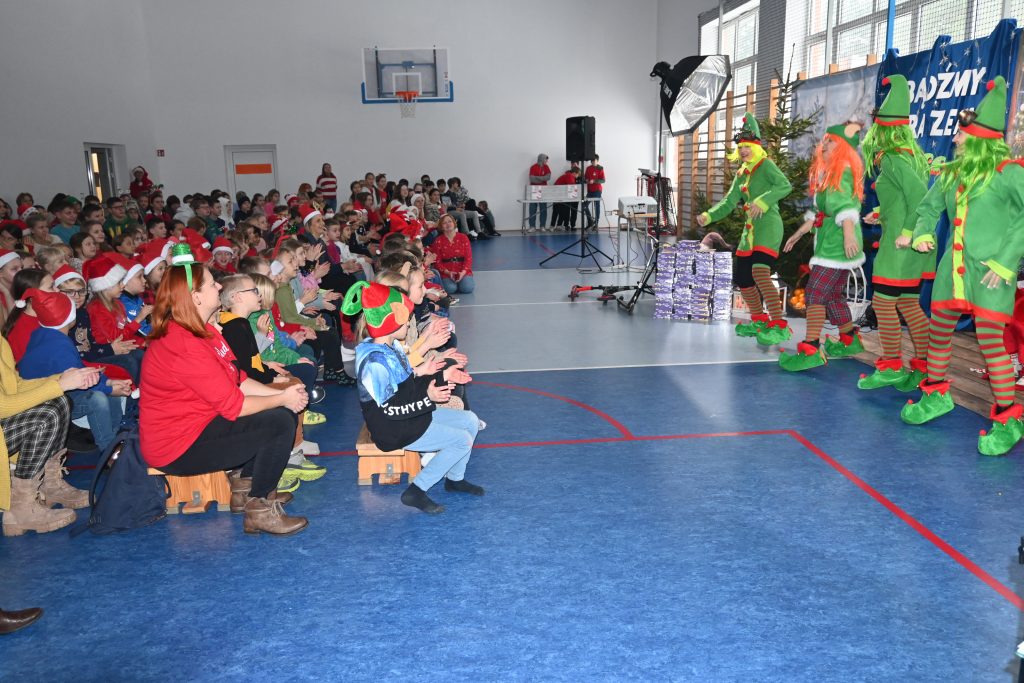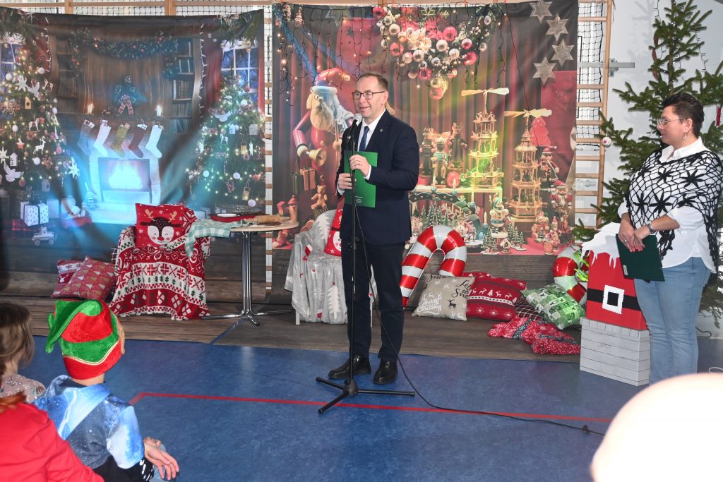 W naszej szkole dokładnie tego dnia bo 6 grudnia, tradycyjnie odbyło się mikołajkowe spotkanie pod hasłem „Bądźmy razem” na które zaproszono całą społeczność szkoły. W scenerii świątecznej z mnóstwem wielokolorowych rozświetlonych światełek, dekoracji i choinek, pani dyrektor Karolina Pasieczna-Szpulecka powitała przybyłych z tej okazji gości: Wójta Gminy Białe Błota Dariusza Fundatora, Wicewójta Pawła Zhuelke, Sołtysa Piotra Mikołaczaka, księdza Proboszcza Zdzisława Lahuttę oraz Kierownika Centrum Obsługi Edukacji i Sportu w Białych Błotach Patrycjusza Migawę, a także zgromadzonych nauczycieli, pracowników i uczniów.