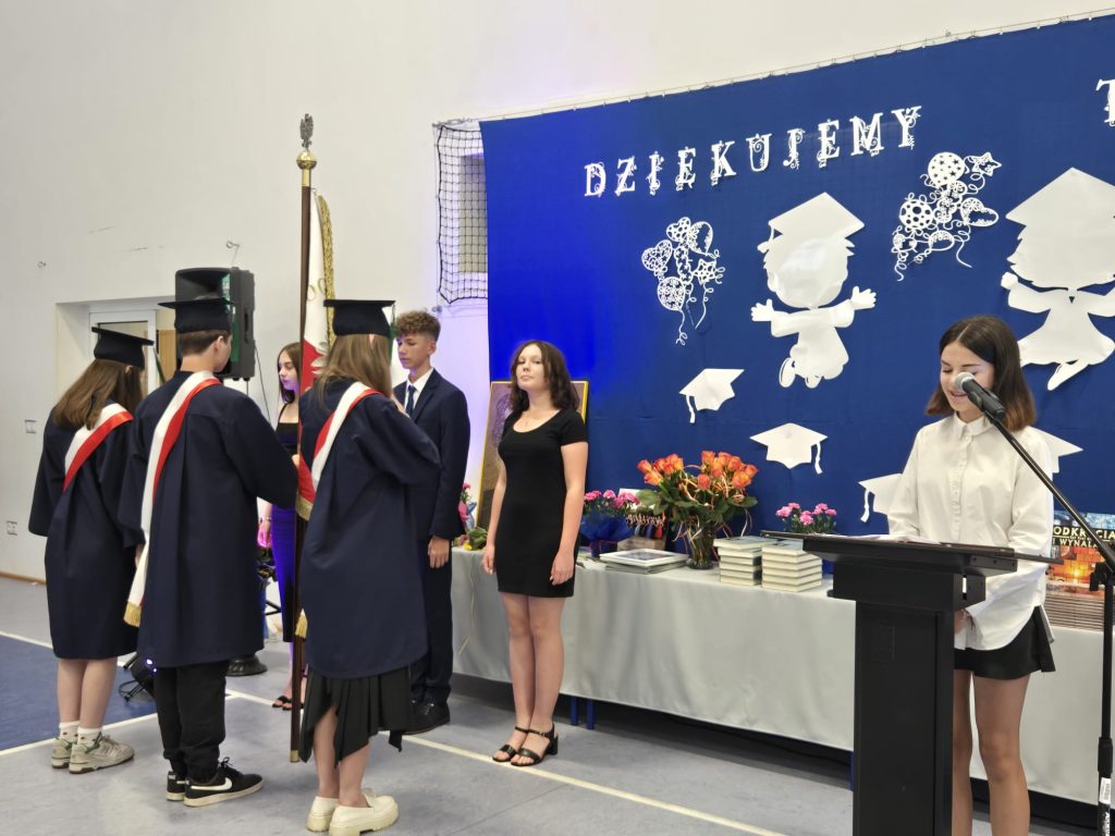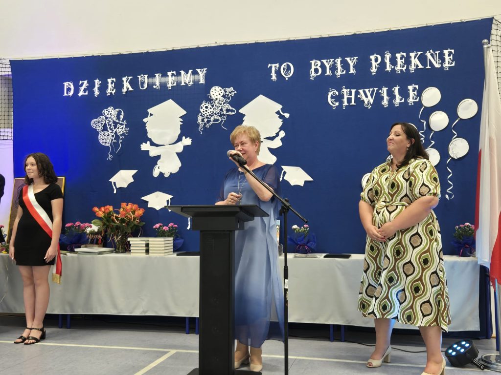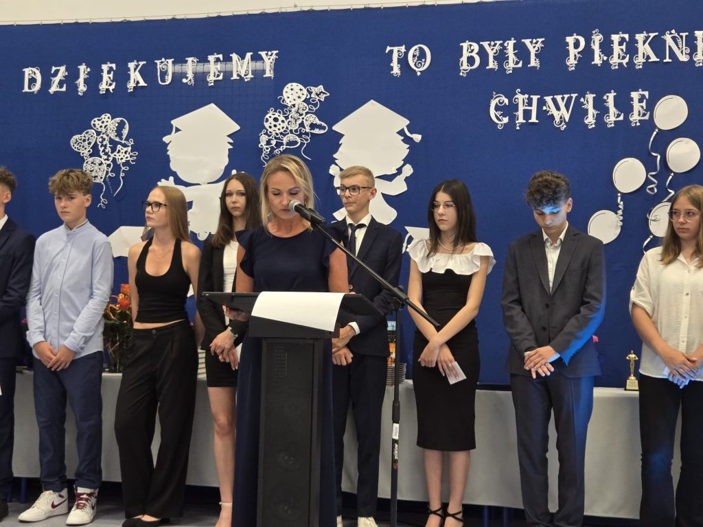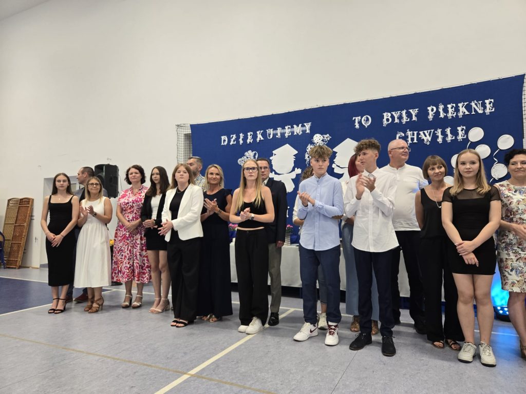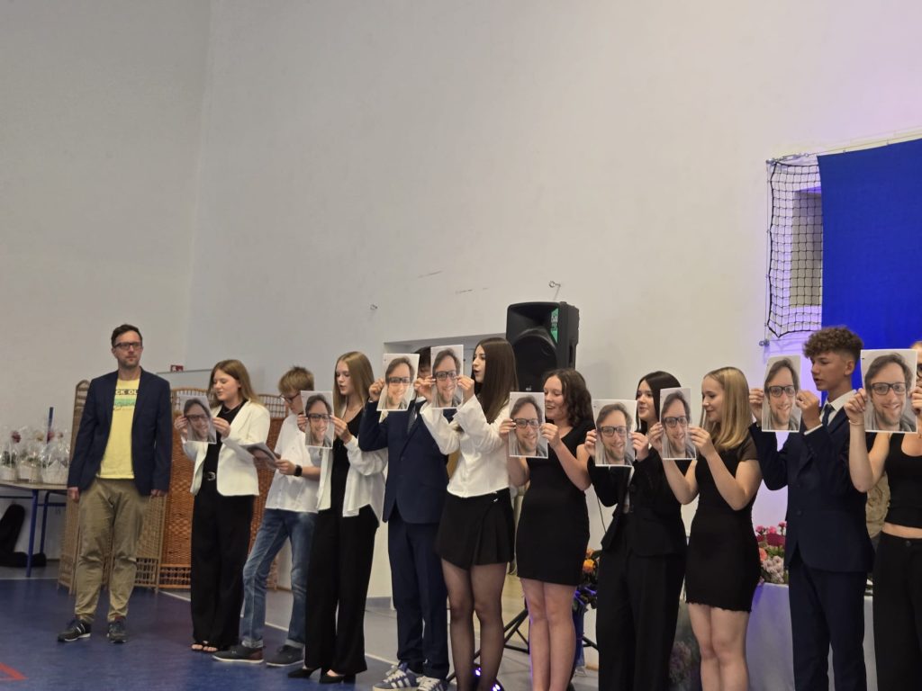 Szczególne podziękowania popłynęły w kierunku nauczycieli, wychowawców i pracowników szkoły – za trud, opiekę i towarzyszenie uczniom w ich ośmioletniej podróży. Nie zabrakło też osobistego pożegnania z panem Tomaszem, nauczycielem geografii, który również żegna się ze szkołą. Ósmoklasiści podziękowali mu z humorem i wzruszeniem, wręczając kwiaty i śpiewając piosenkę specjalnie dla niego.