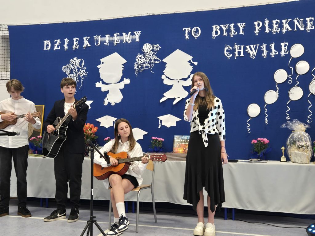 Uczniowie przygotowali także bogaty program artystyczny – występy muzyczne, piosenki, wspomnienia, wręczenie symbolicznych podziękowań nauczycielom, wychowawcom i rodzicom. Szczególne emocje wzbudził kabaret przygotowany przez klasę 8a – pełen dystansu, żartów i szkolnych wspomnień.
