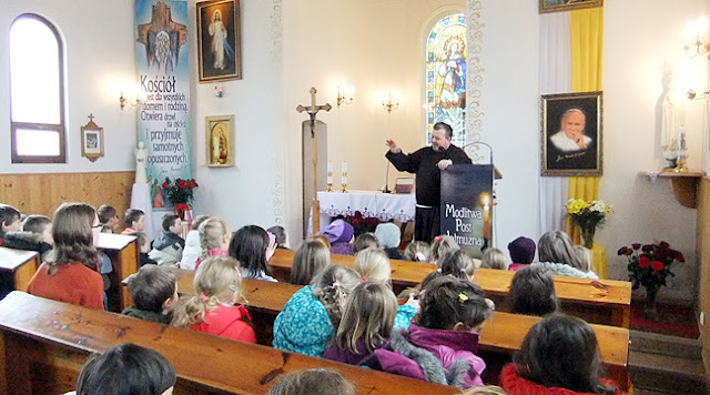 Gościliśmy w naszej Parafii zakonnika z zakonu Braci Kapucynów z Bydgoszczy. Przybył on z rycerskim rynsztunkiem, przypominając w ten sposób o etosie prawdziwego rycerza. Przez moment uczniowie mogli poczuć się jak prawdziwi rycerze dla których najważniejsze jest posłuszeństwo i wierność Bogu. Z tymi wartościami wkroczyliśmy w XXI wiek by swym codziennym postępowaniem dawać dowody swej wiary.
