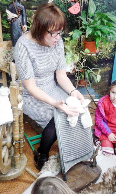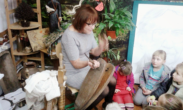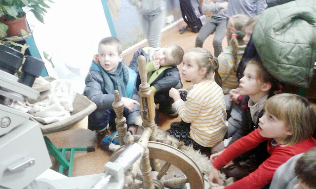 W klasie Ib spróbowaliśmy cofnąć się w czasie do epoki naszych prababć. Mało kto wie, że w naszej szkole istnieje taka symboliczna izba pamięci. Pani Dyrektor zademonstrowała pierwszakom, jakie dawno temu urządzenia ułatwiały ludziom życie. Okazało się, że można żyć bez prądu. Mogliśmy zobaczyć: tarę do prania, lampę naftową, hantle do noszenia wody, kołowrotek, dzieżę do ciasta a nawet krajalnicę.