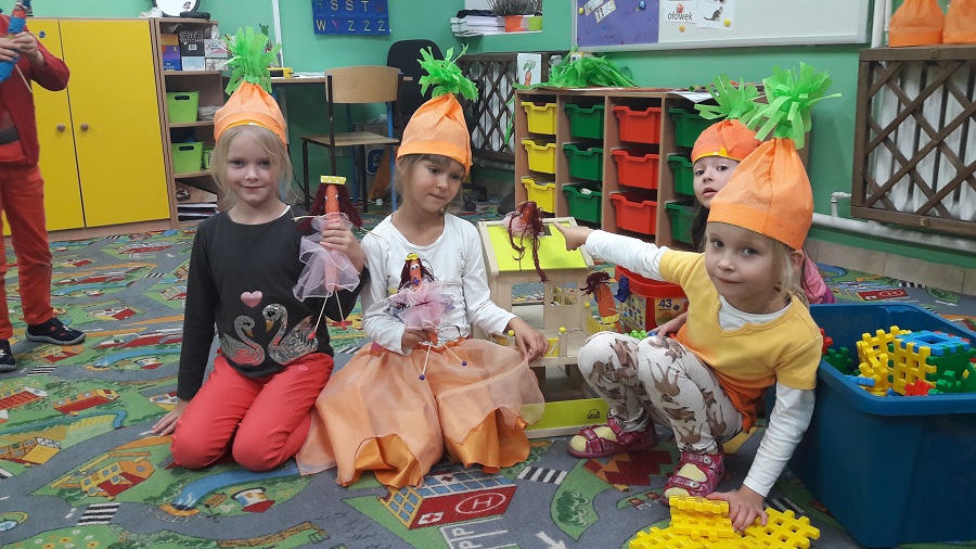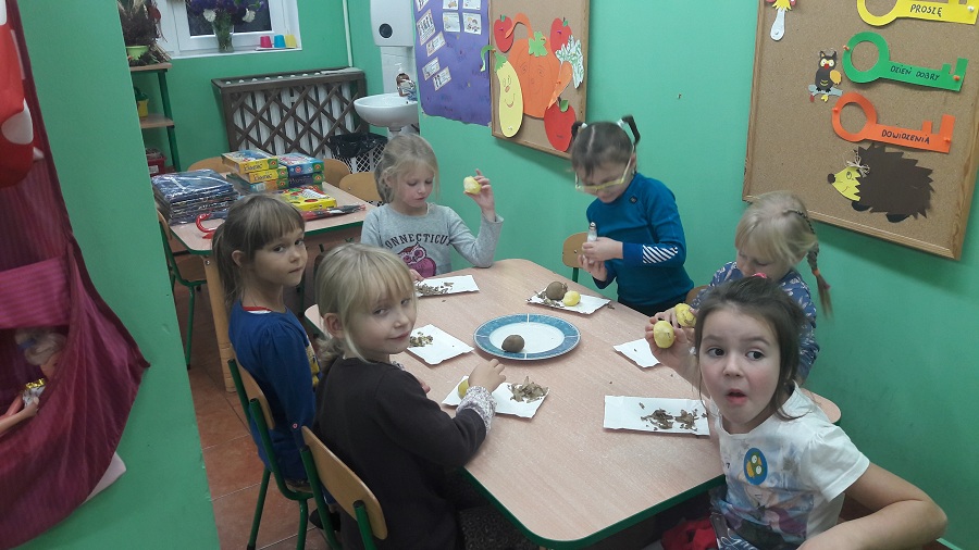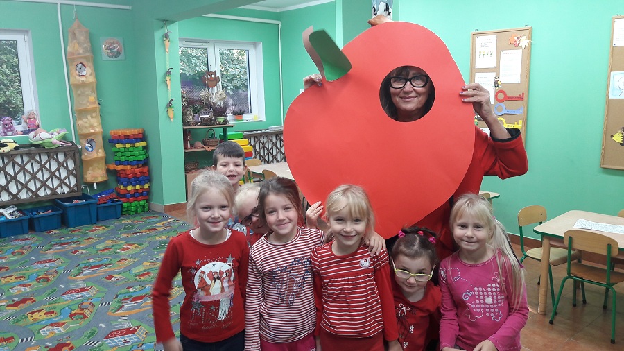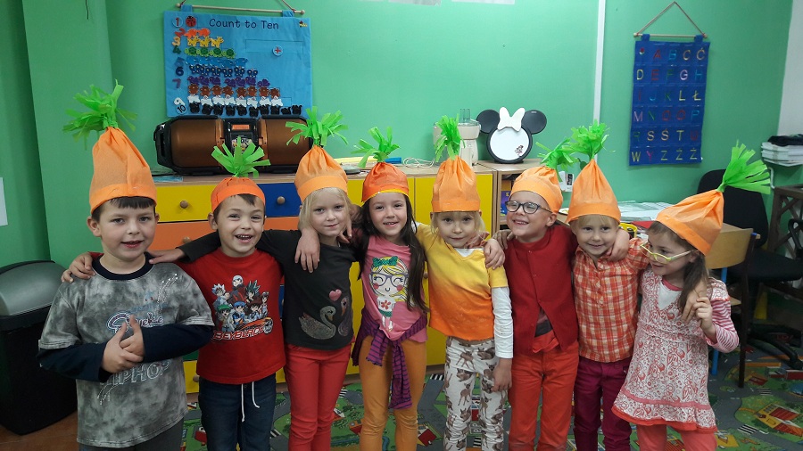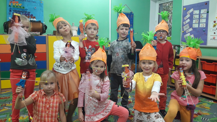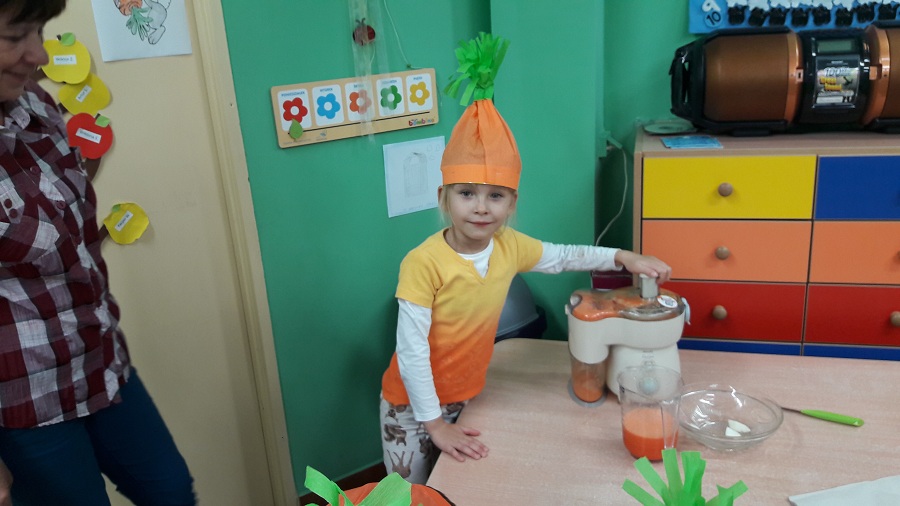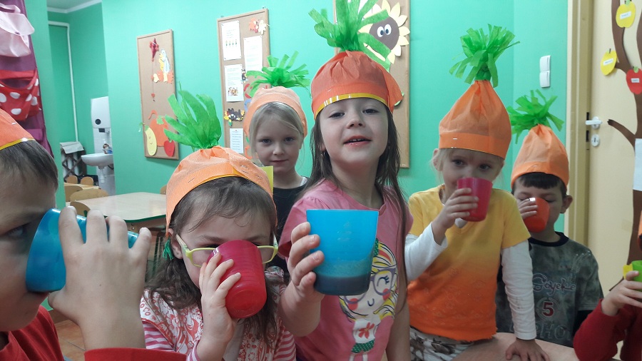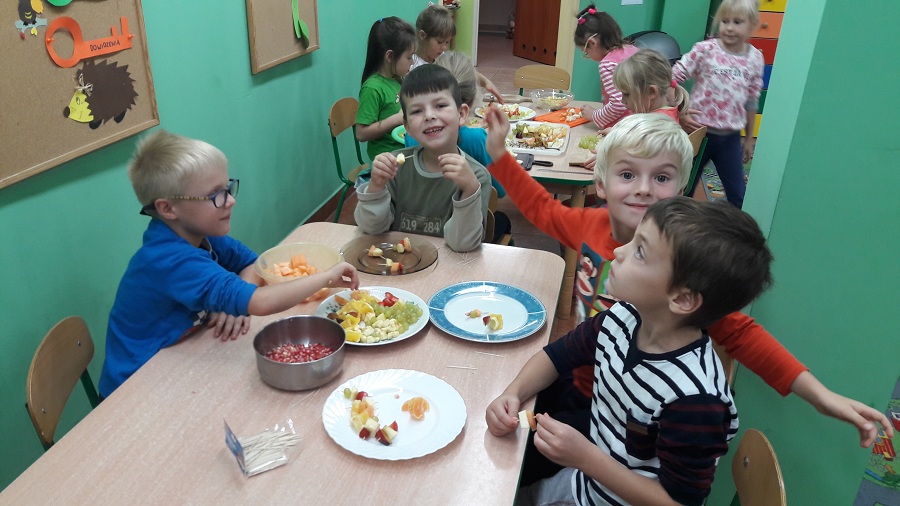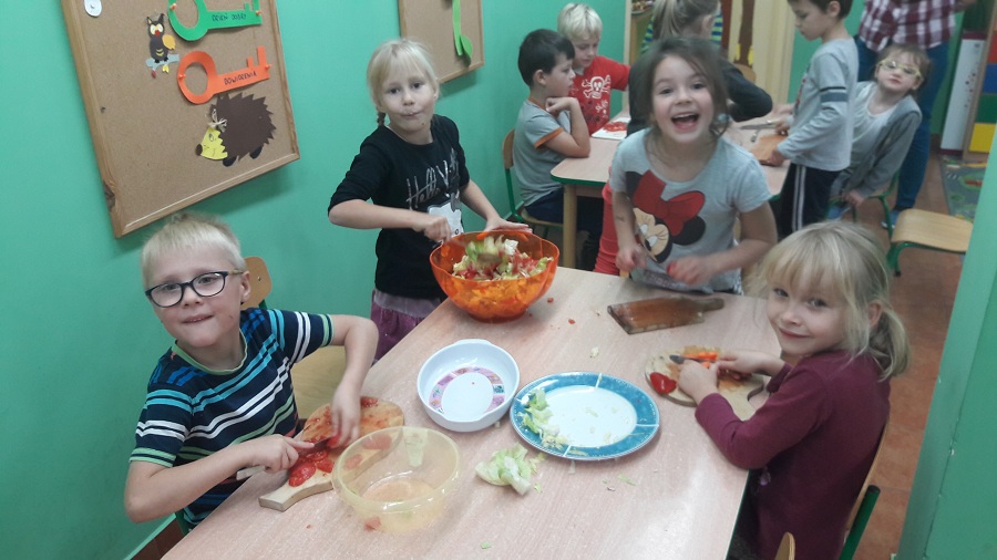 Przez cały tydzień w klasie „0” realizowaliśmy zagadnienia, które pozwoliły dzieciom umiejscowić warzywa i owoce w Piramidzie Zdrowia i uświadomić im, że dostarczanie ich w odpowiedniej ilości każdego dnia, gwarantuje zdrowie i odporność na choroby. Dzieci rozpoznawały i nazywały warzywa i owoce, poznawały ich zapachy i części jadalne. Odbywało się to wszystko poprzez zabawy, gry, teatrzyki, krzyżówki i konkursy ale również przez praktyczne działanie. Dzięki temu przedszkolaki łatwiej zapamiętały niezbędne dla nich wiadomości. Dzieci brały również udział w warsztatach kulinarnych, które pomogły im dokładniej zrozumieć poruszane temat. Robiliśmy zdrowe soki owocowo-warzywne, koreczki owocowe, sałatki warzywne. Wzięliśmy udział w konkursie na „cudaka z ziemniaka i innych warzyw”. Prace były pomysłowe, piękne i smakowite przy okazji. Wszystkie dzieci zostały nagrodzone.