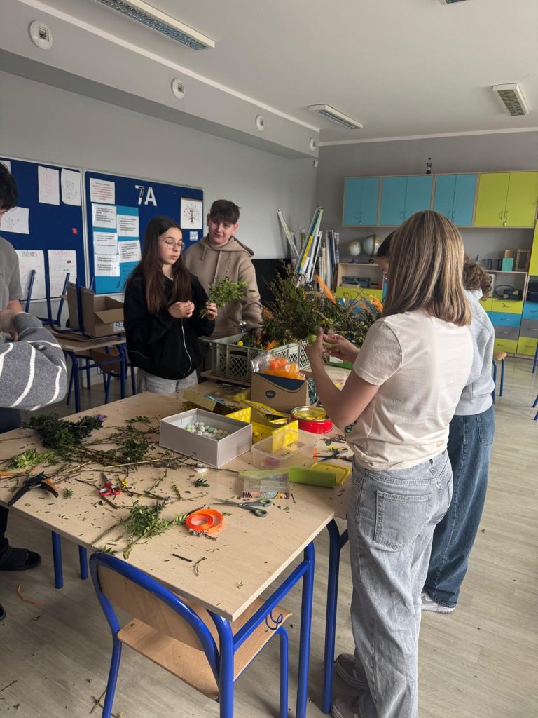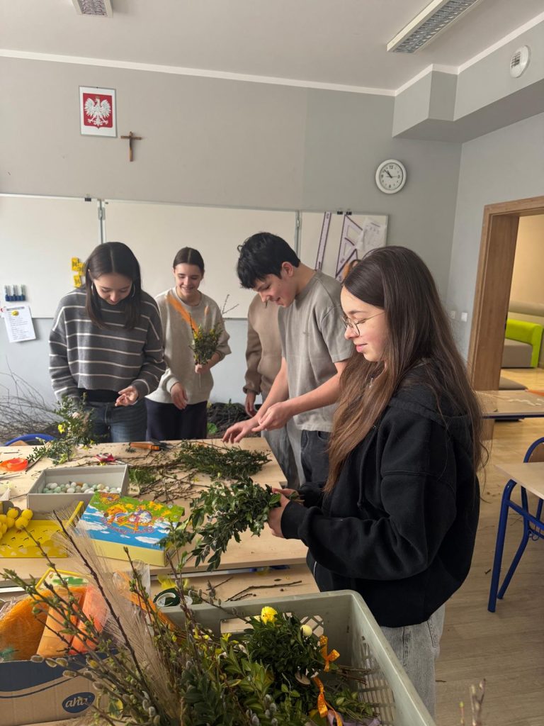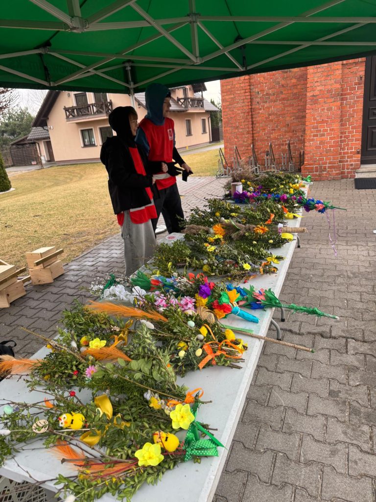 Kolejnym działaniem były warsztaty wielkanocne, podczas których uczniowie własnoręcznie wykonali tradycyjne palmy. Przygotowane prace zostały wystawione na kiermaszu wielkanocnym, ciesząc się dużym zainteresowaniem.