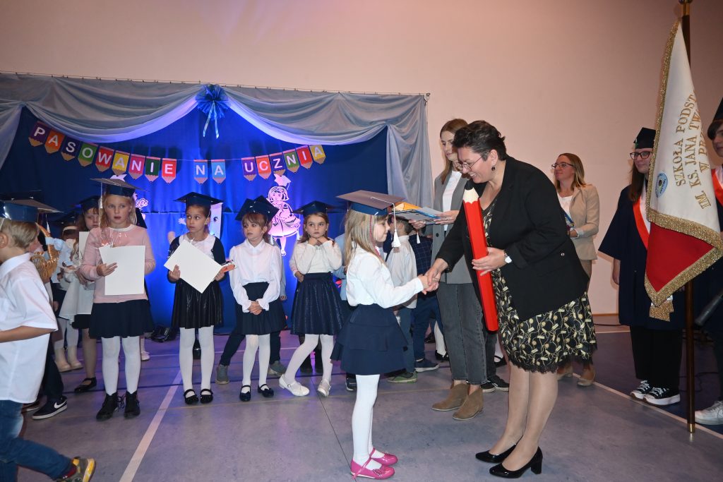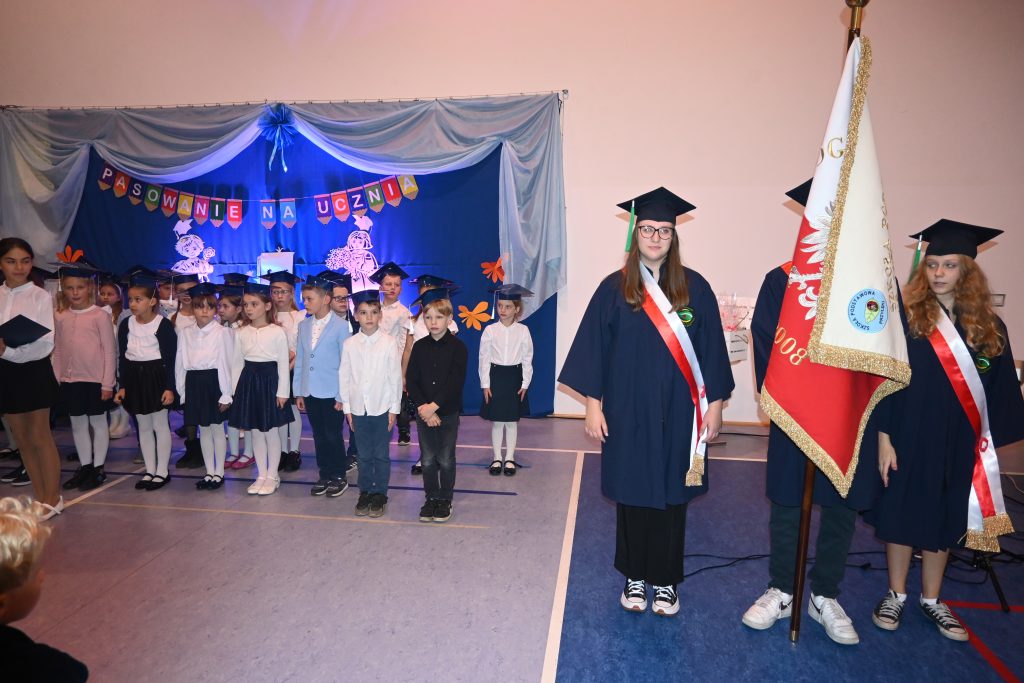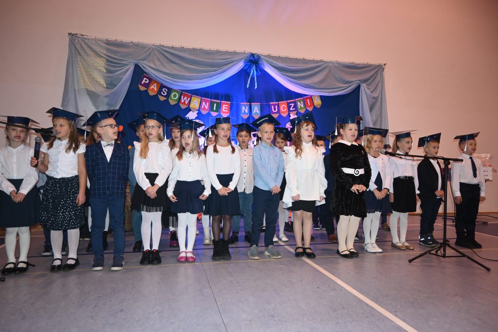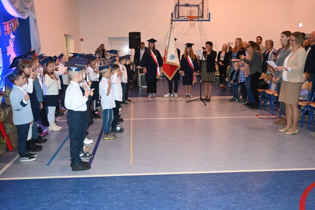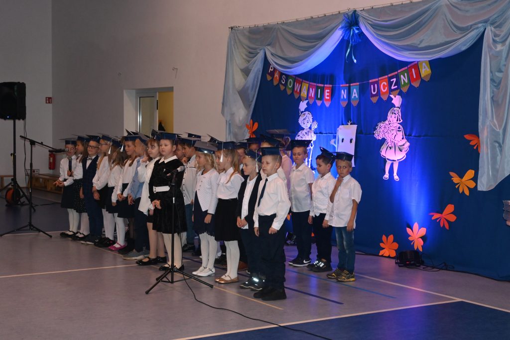 Uczniowie klasy 1 a i 1b rozpoczęli uroczystość wspaniałym występem artystycznym, który zachwycił wszystkich zebranych gości. Zaprezentowali recytację wierszy, zaśpiewali piosenki oraz pochwalili się swoją wiedzą. Najważniejszą częścią uroczystości, na którą wszyscy czekali było ślubowanie oraz pasowanie wielkim ołówkiem przez Dyrektor Szkoły Karolinę Pasieczną-Szpulecką. Pierwszaki głośno i z przekonaniem przyrzekały być dobrymi i pilnymi uczniami oraz rzetelnie wypełniać swoje obowiązki, o czym przypominać im będą otrzymane dyplomy oraz podarunki przygotowane zarówno przez rodziców jak i zaproszonych gości.