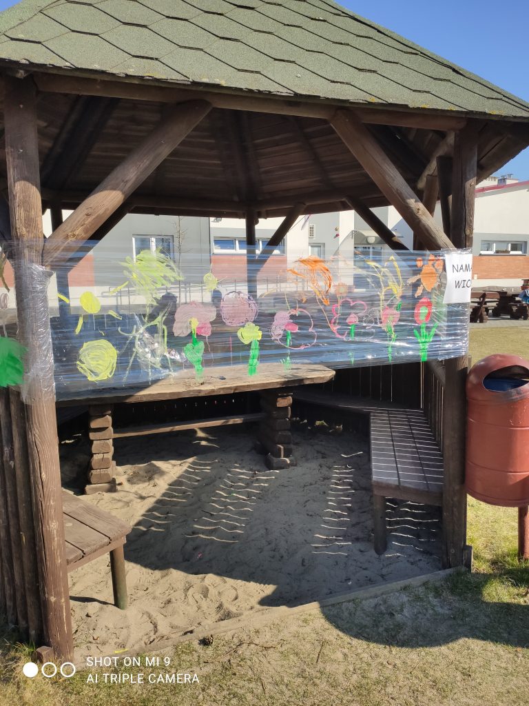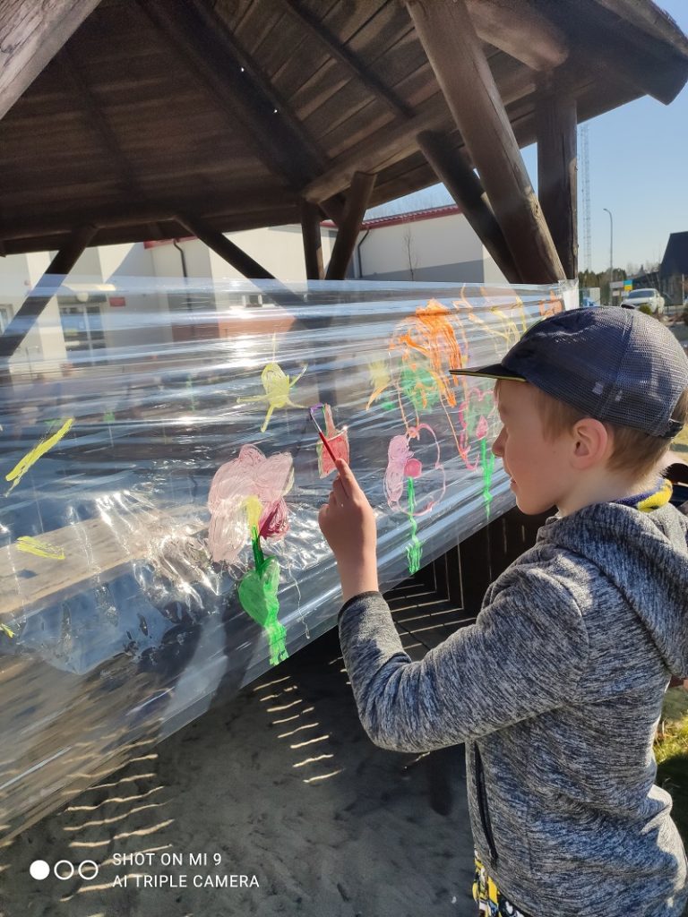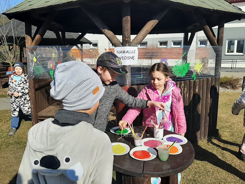 Bardzo dużym zainteresowaniem cieszyło się malowanie wiosny na folii. W to działanie zaangażowały się nawet starsze klasy. Powstał piękny wiosenny obraz.