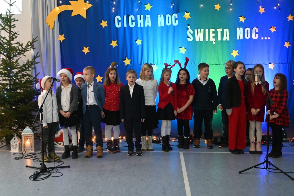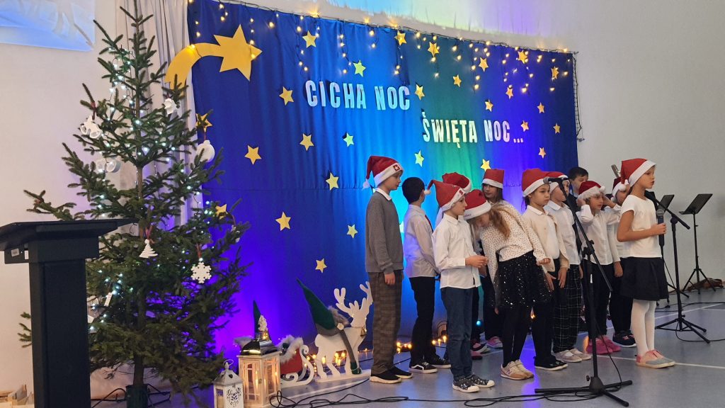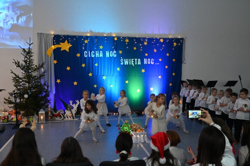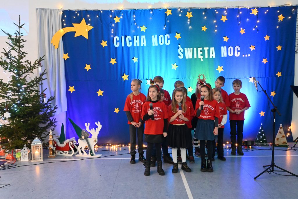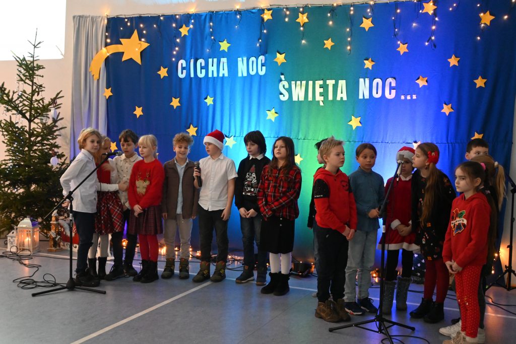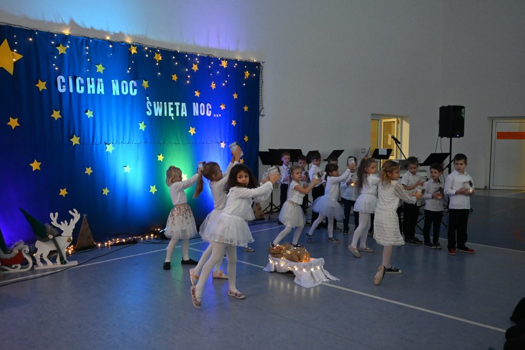 Najmłodsi uczniowie z oddziału przedszkolnego rozpoczęli koncert pięknym, nastrojowym tańcem z lampionami. Usłyszeliśmy świąteczne wiersze patrona naszej szkoły – ks. Jana Twardowskiego, które odczytali uczniowie starszych klas. Śpiewaliśmy świąteczne piosenki i kolędy, a na koniec uroczystości tradycyjnie wystąpiło koło fletowe.