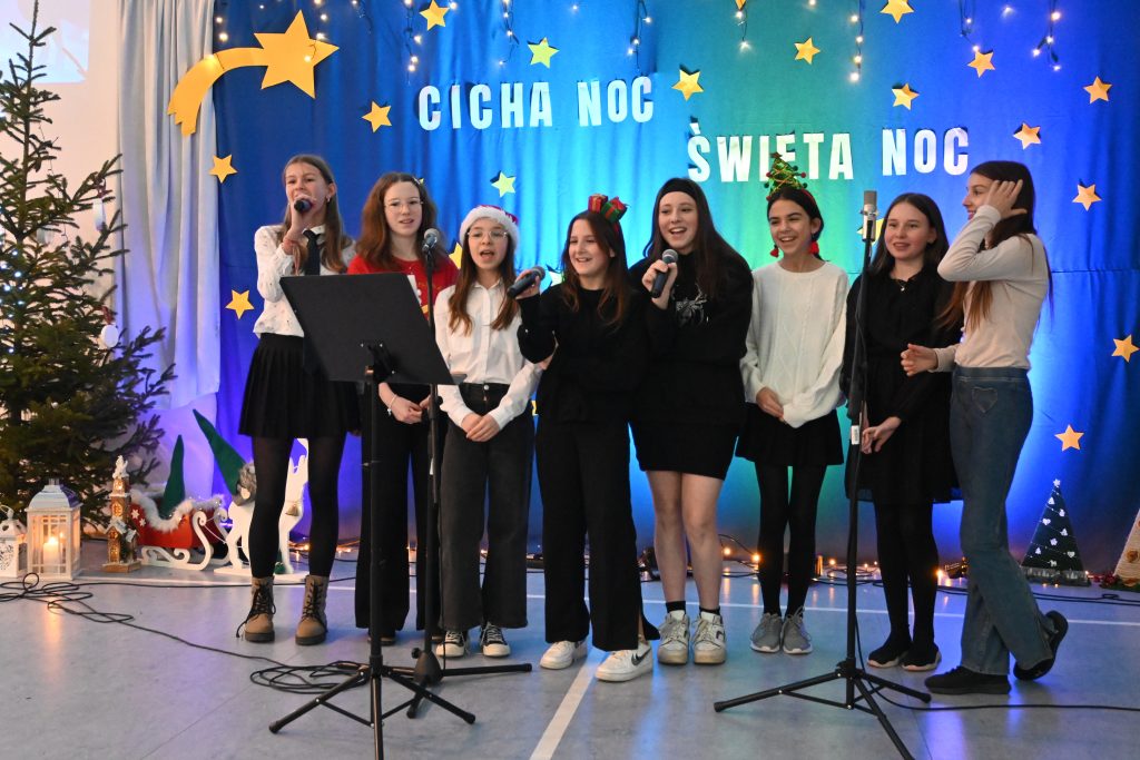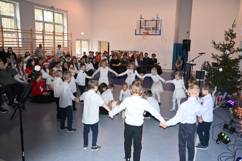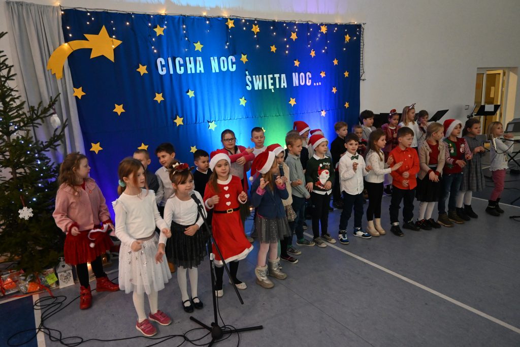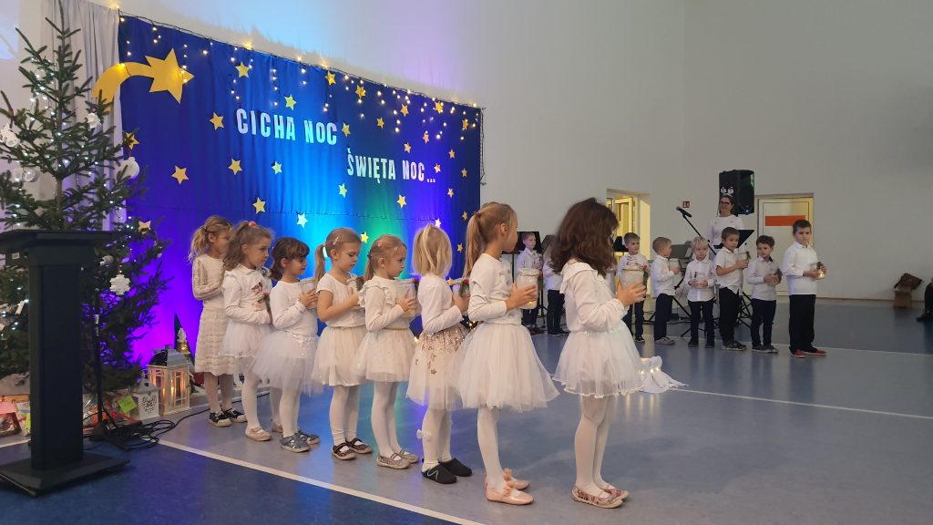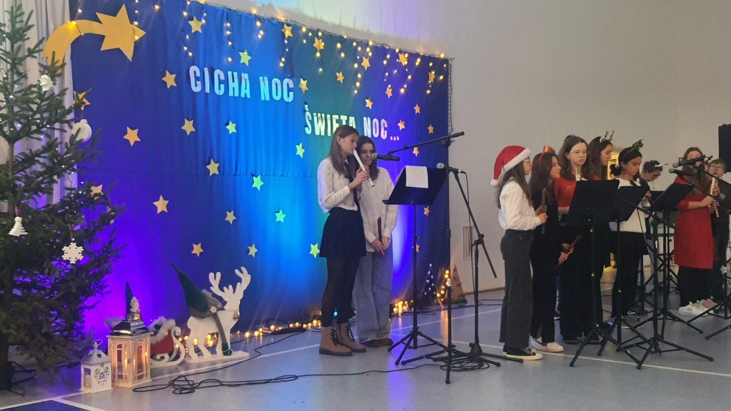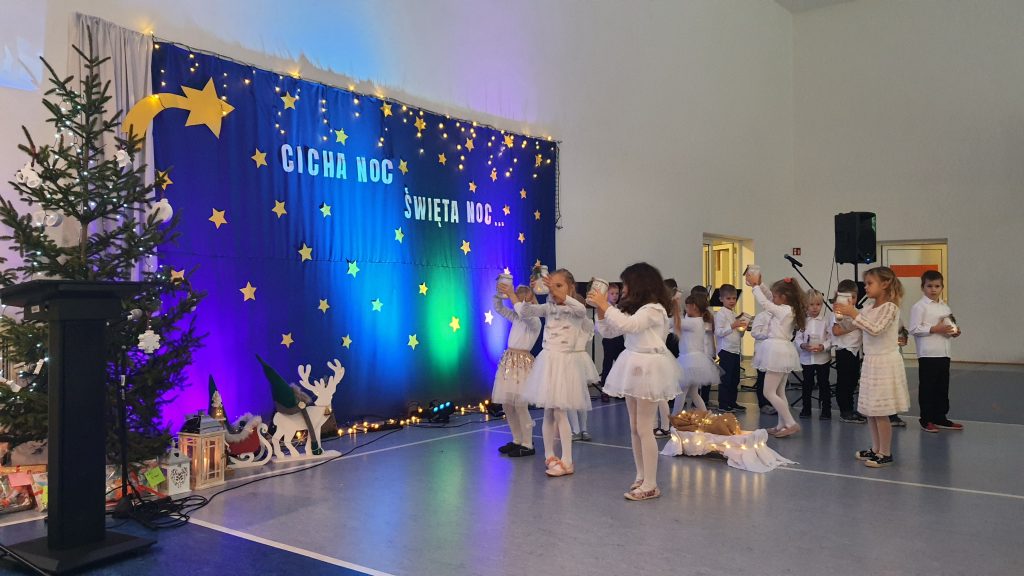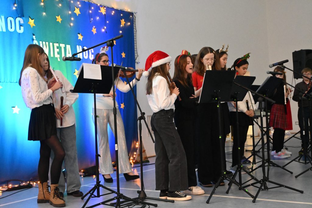 Najmłodsi uczniowie z oddziału przedszkolnego rozpoczęli koncert pięknym, nastrojowym tańcem z lampionami. Usłyszeliśmy świąteczne wiersze patrona naszej szkoły – ks. Jana Twardowskiego, które odczytali uczniowie starszych klas. Śpiewaliśmy świąteczne piosenki i kolędy, a na koniec uroczystości tradycyjnie wystąpiło koło fletowe.