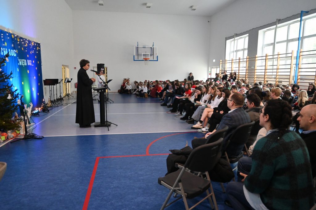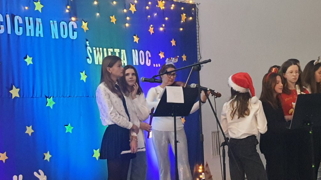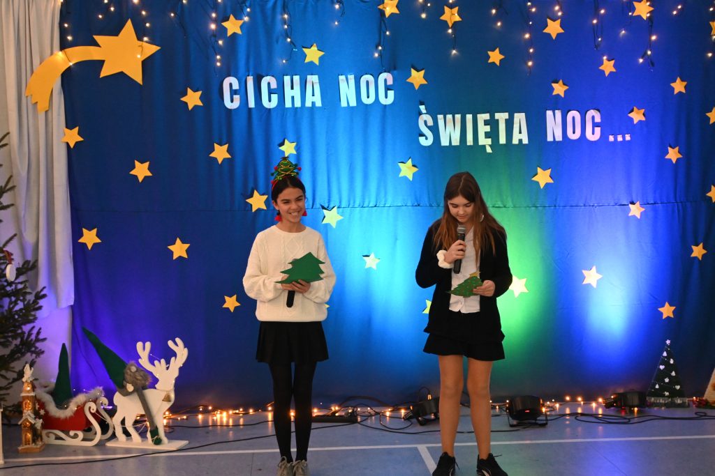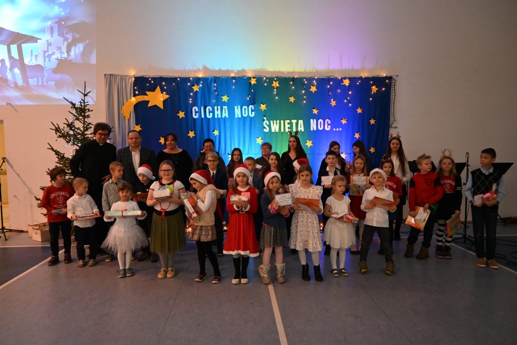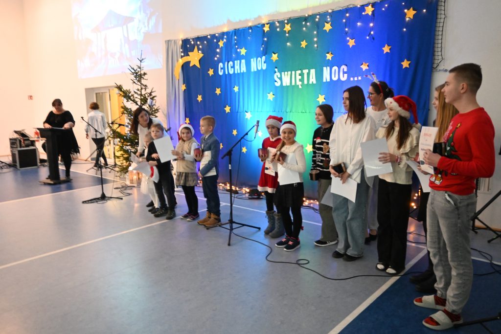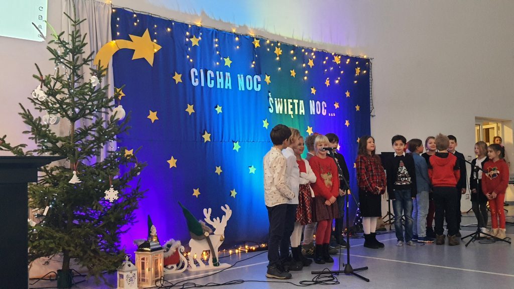 Najmłodsi uczniowie z oddziału przedszkolnego rozpoczęli koncert pięknym, nastrojowym tańcem z lampionami. Usłyszeliśmy świąteczne wiersze patrona naszej szkoły – ks. Jana Twardowskiego, które odczytali uczniowie starszych klas. Śpiewaliśmy świąteczne piosenki i kolędy, a na koniec uroczystości tradycyjnie wystąpiło koło fletowe.