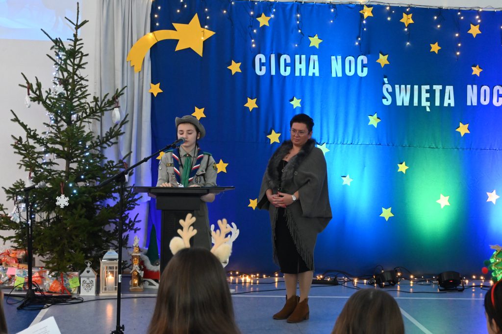 W nastrój zbliżających się Świąt Bożego Narodzenia wprowadził nas wystrój sali oraz wspaniałe występy naszych uczniów. Na ręce pani Dyrektor zostało w uroczysty sposób przekazane Betlejemskie Światełko Pokoju, którego w tym roku strażniczką została Wiktoria Ściuk.