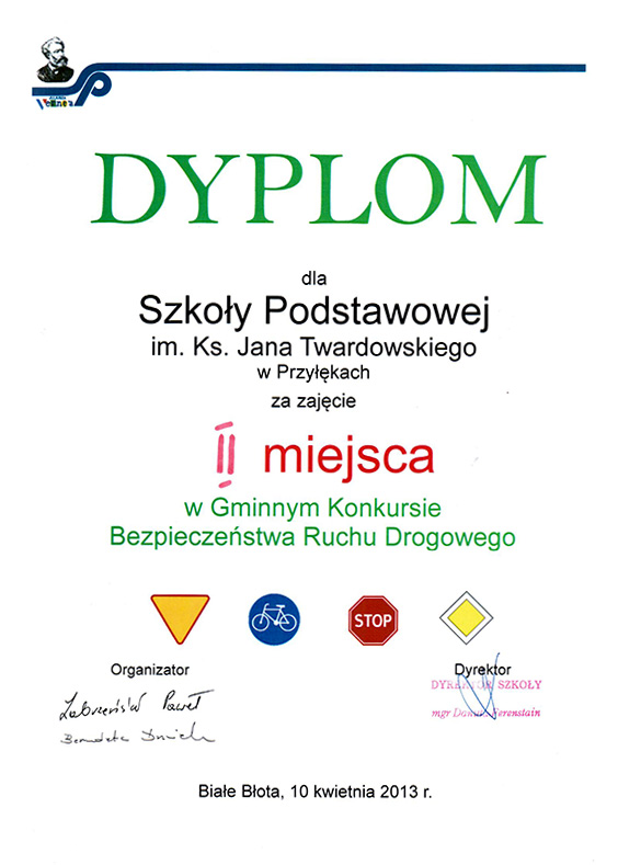 10 kwietnia uczniowie klasy V w składzie: Szymon Błaszyk, Mateusz Falowski, Klaudiusz Wojciechowski uczestniczyli w Gminnym Konkursie Bezpieczeństwa Ruchu Drogowego organizowanym przez Szkołę Podstawową im. Juliusza Verne’a w Białych Błotach.