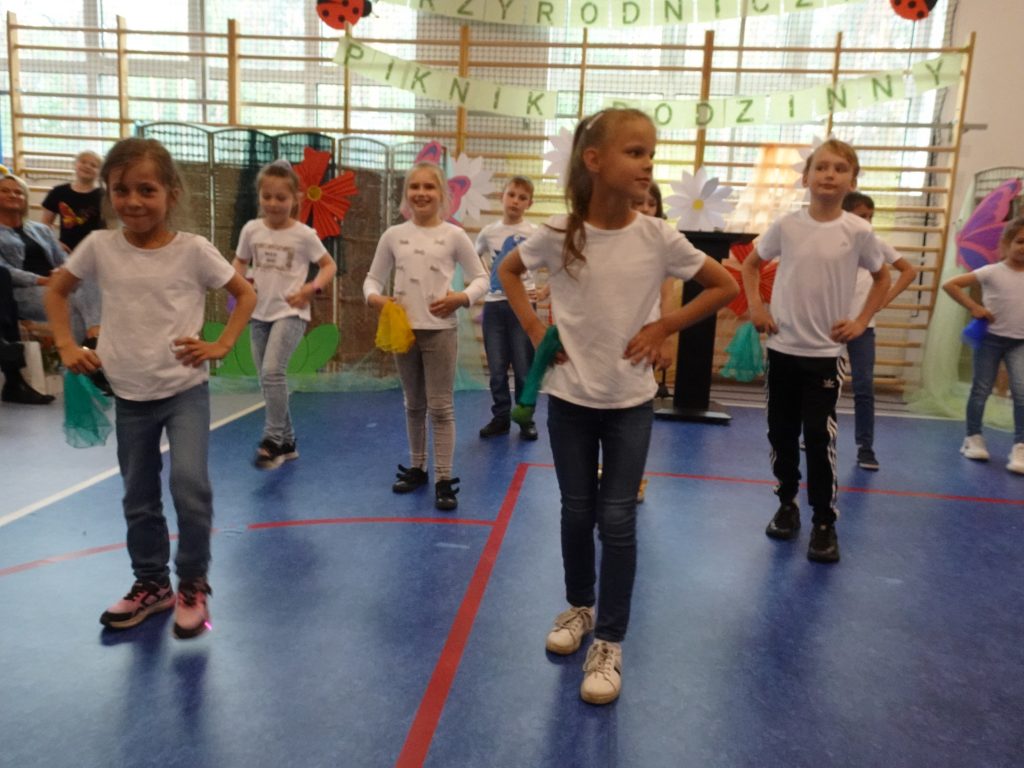 Oczywiście przyłęckim zwyczajem również pedagodzy i pracownicy szkoły, wykazując się ogromnym dystansem do siebie i odwagą, uświetnili ten dzień, zapraszając dzieci i dorosłych do wspólnych wygibasów na Zumbie. Dzięki temu z czystym sumieniem wszyscy mogli bezkarnie objadać się pysznym ciastem przygotowanym przez rodziców oraz kiełbaskami z grilla. W beztroski, wręcz wakacyjny nastrój wprowadziły biesiadujących szanty.