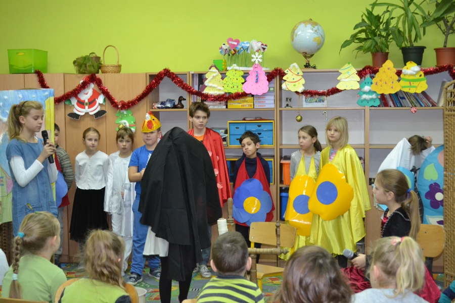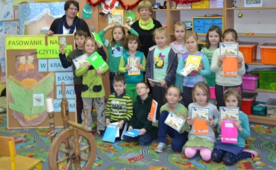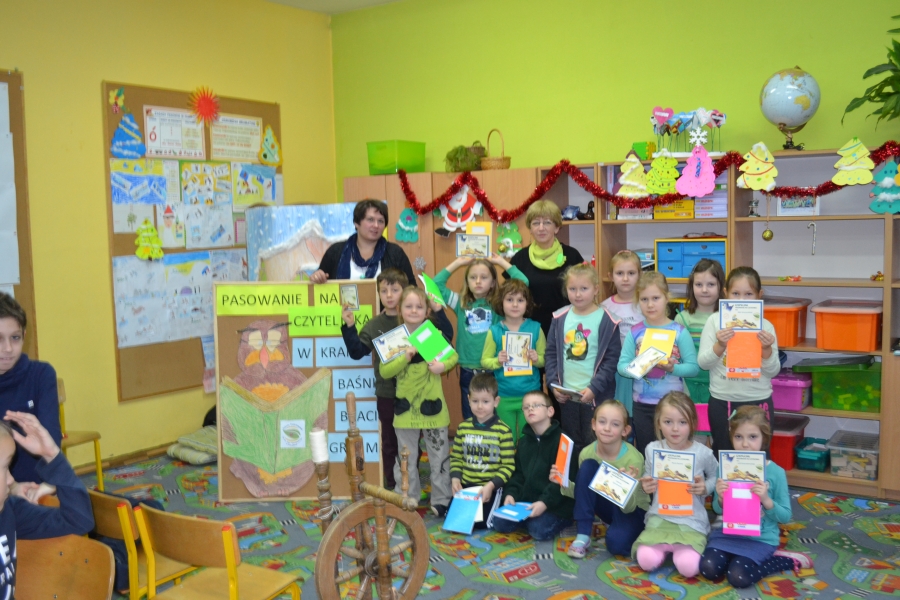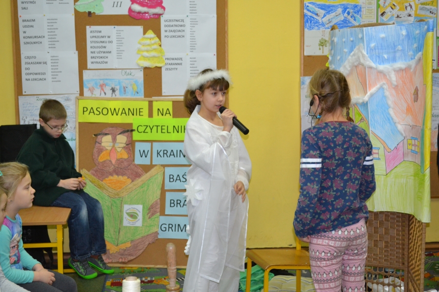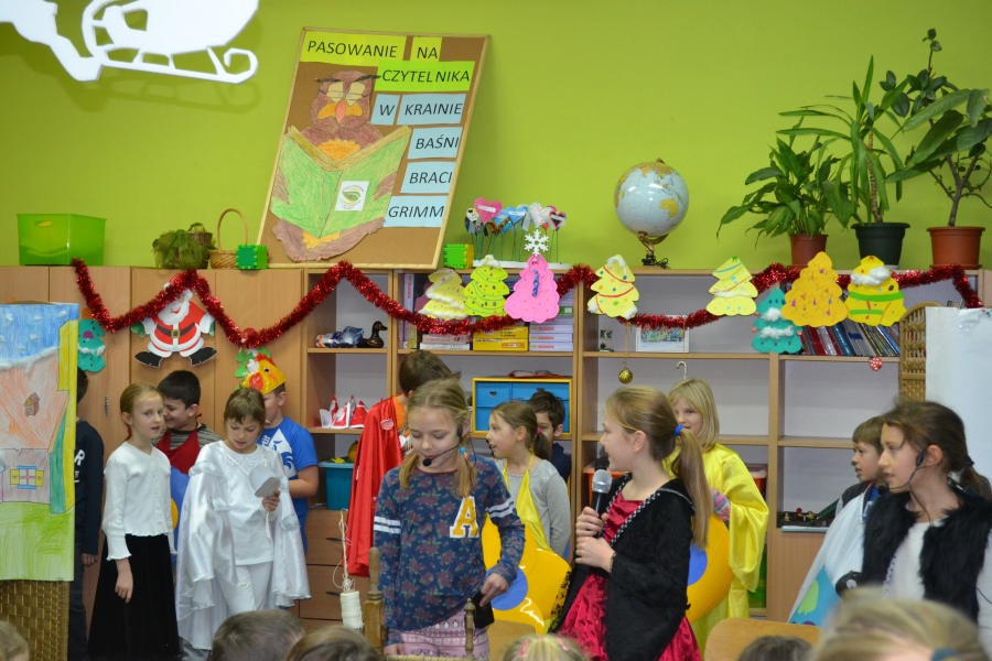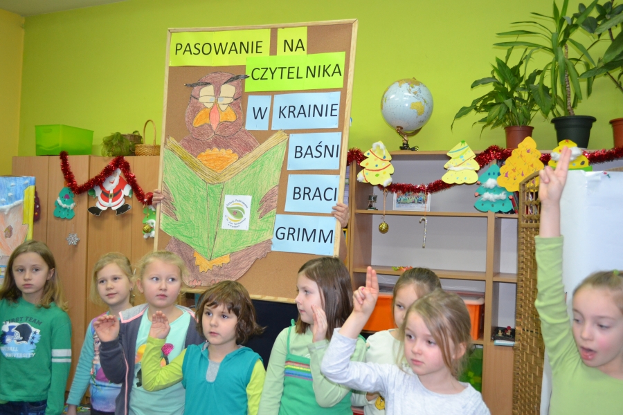 Tegoroczna uroczystość pasowania na czytelnika przygotowywana została przez uczniów klasy trzeciej tuż przed zimowym wypoczynkiem. Zaprezentowane przez nich przedstawienie pt. „Pani Zima” wprowadzało małych czytelników w świat baśni braci Grimm, w których panuje żelazne prawo moralne – dobro i przezorność zwyciężają niegodziwość. Po przedstawieniu uczniowie klasy pierwszej złożyli uroczystą przysięgę, po której otrzymali pamiątkowe dyplomy oraz zeszyty lektur. W drugiej części spotkania odbył się konkurs czytelniczy dot. twórczości W i J Grimm, podczas którego uczniowie klasy pierwszej wykazali się znakomitą znajomością treści baśni braci Grimm.