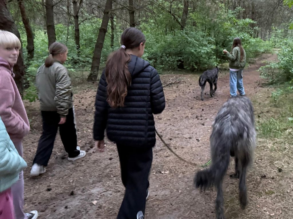 Spotkanie zaczęliśmy od wieczornego spaceru z Eltonem i Nessie, który jak zawsze był okazją do obserwacji psich zachowań i rozmowy na ten temat. Psy odprowadziliśmy na noc do ich domu, a sami wróciliśmy do szkoły na noc filmową. W repertuarze były do wyboru cztery filmy o psach. Mieliśmy obejrzeć jeden, a w rezultacie obejrzeliśmy trzy, bo nie chciało nam się spać. Najwytrwalsi poszli spać po trzeciej nad ranem. Może i byli potem niewyspani, ale niczego nie żałują.