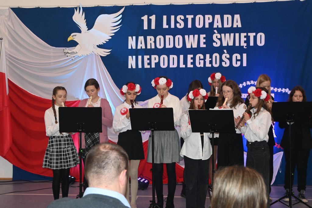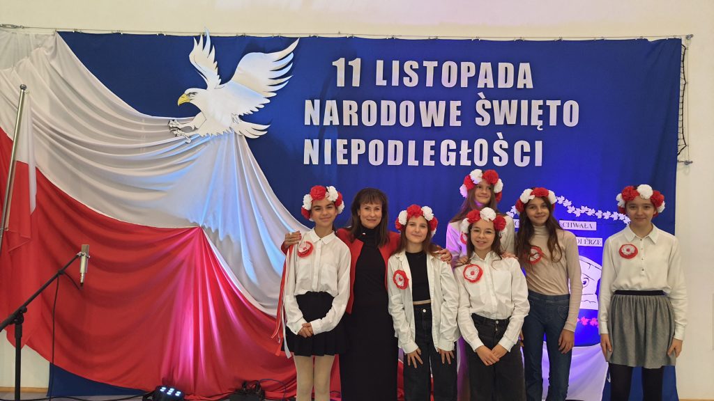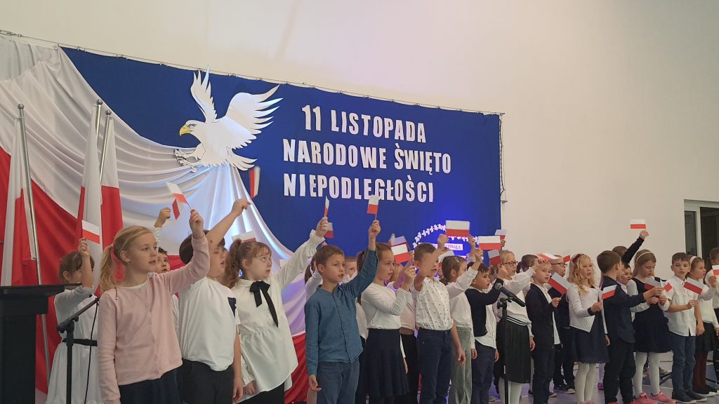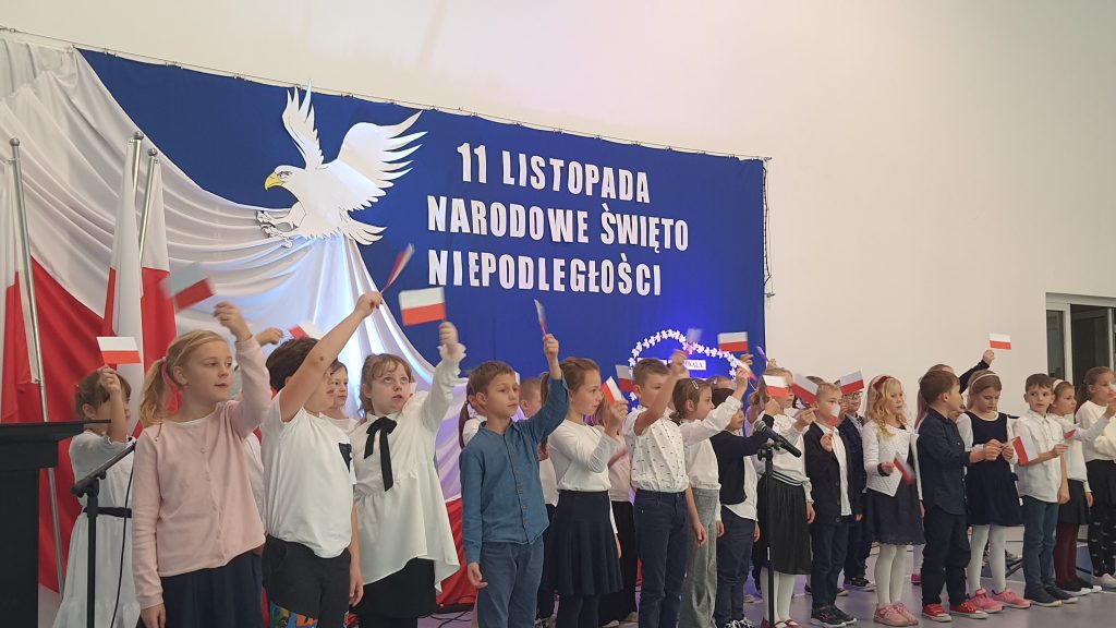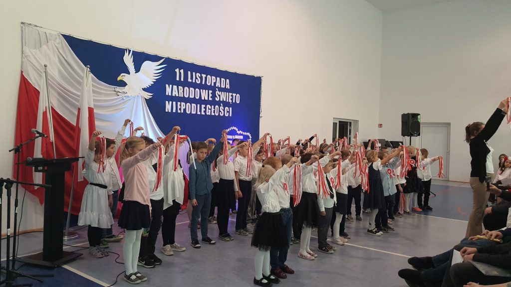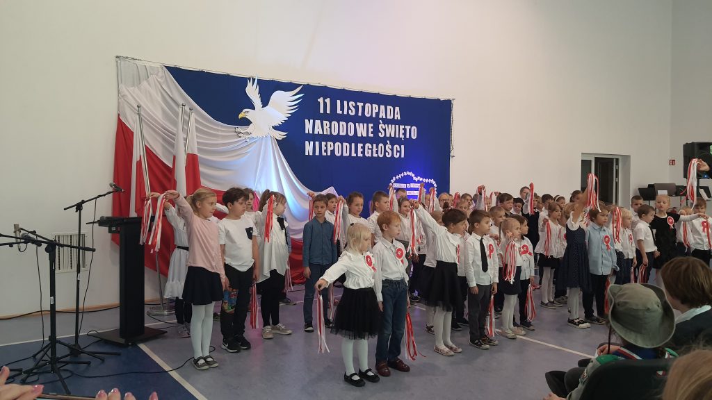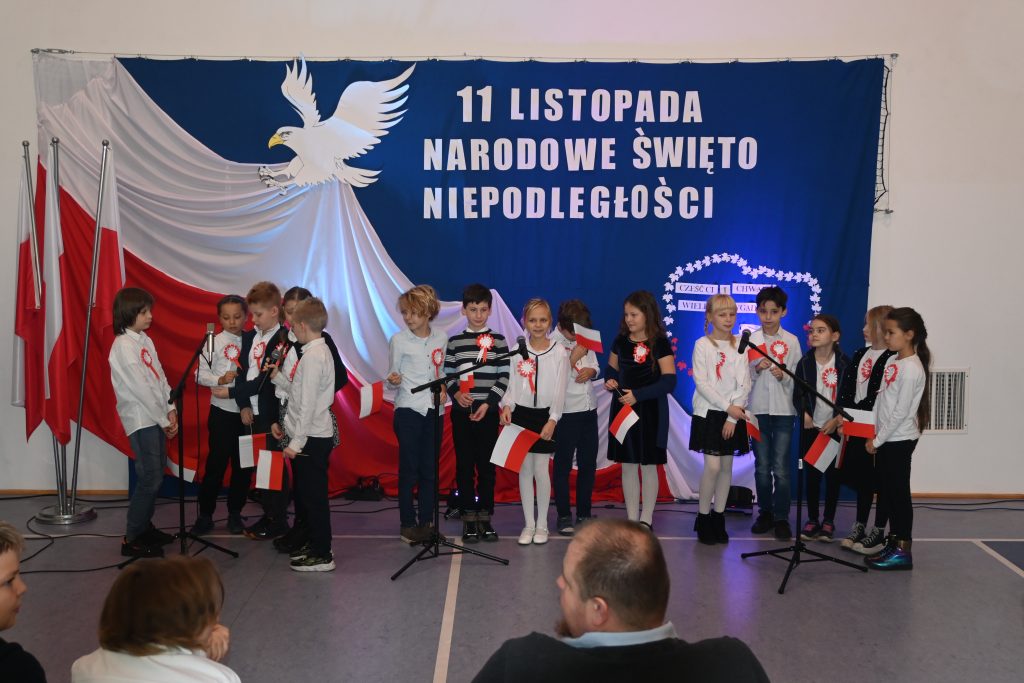 Uczniowie przygotowani przez panią Annę Barbachen w montażu słowno-muzycznym przybliżyli historię obchodzonego święta i ze wzruszeniem odśpiewali polskie pieśni żołnierskie i patriotyczne.