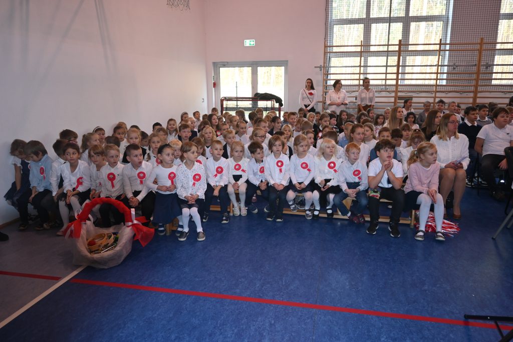 Narodowe Święto Niepodległości obchodzimy 11 listopada dla upamiętnienia powrotu Polski na mapy świata po 123 latach zaborów. Ściśle związane ze świętowaniem odzyskania niepodległości przez Polskę są nasze symbole narodowe. Należą do nich barwy narodowe, flaga i godło państwowe oraz hymn. Właśnie dlatego 10 listopada w przeddzień Narodowego Święta Niepodległości podczas uroczystego apelu dominowały barwy biało-czerwone. W odświętnych strojach, z flagami w dłoni i kotylionami przypiętymi po stronie serca, uczniowie Szkoły Podstawowej im. ks. J. Twardowskiego w Przyłękach zasiedli na widowni w sali gimnastycznej.
