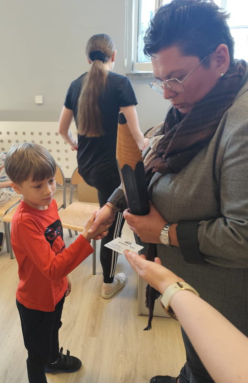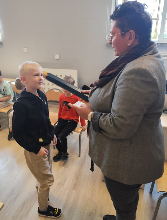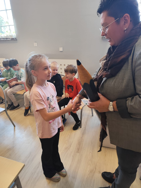 Następnie przyszedł czas na najważniejszy moment – uroczyste pasowanie na czytelnika, którego dokonała pani dyrektor Karolina Pasieczna-Szpulecka, dotykając ramię każdego ucznia symbolicznym ołówkiem. Wszyscy nowi czytelnicy otrzymali karty biblioteczne, a także wyprawkę czytelniczą: pięknie ilustrowane książki oraz kolorowe zakładki – własność, która z pewnością zachęci do częstych wizyt w bibliotece.