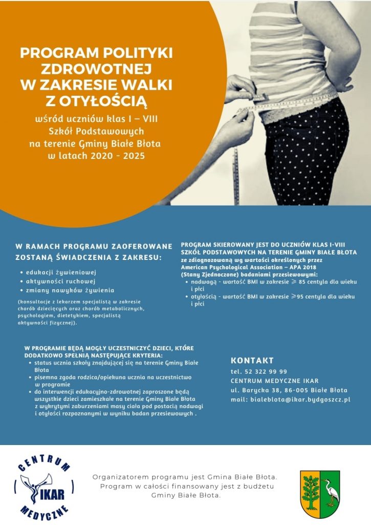 Sposobem na zahamowanie rosnącej fali dziecięcej nadwagi i otyłości mogą być szeroko zakrojone programy profilaktyczne. Aby zapobiegać narastającemu zjawisku otyłości wśród dzieci niezbędna jest profilaktyka, której realizatorem na terenie Gminy Białe Błota jest Centrum Medyczne IKAR w Białych Błotach, które w ramach programu oferuje świadczenia