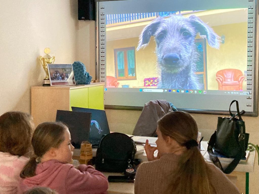 Po powrocie do sali uczniowie obejrzeli krótką prezentację w języku angielskim, w której Elton „opowiedział” o swoim dzieciństwie i tym, jak trafił do swojego domu. Prezentacja wzbudziła wiele emocji i zainteresowania. Dzieci pracowały z tekstem, uczyły się nowych słówek i ćwiczyły głośne czytanie. Dzięki temu nauka języka angielskiego stała się ciekawą przygodą.