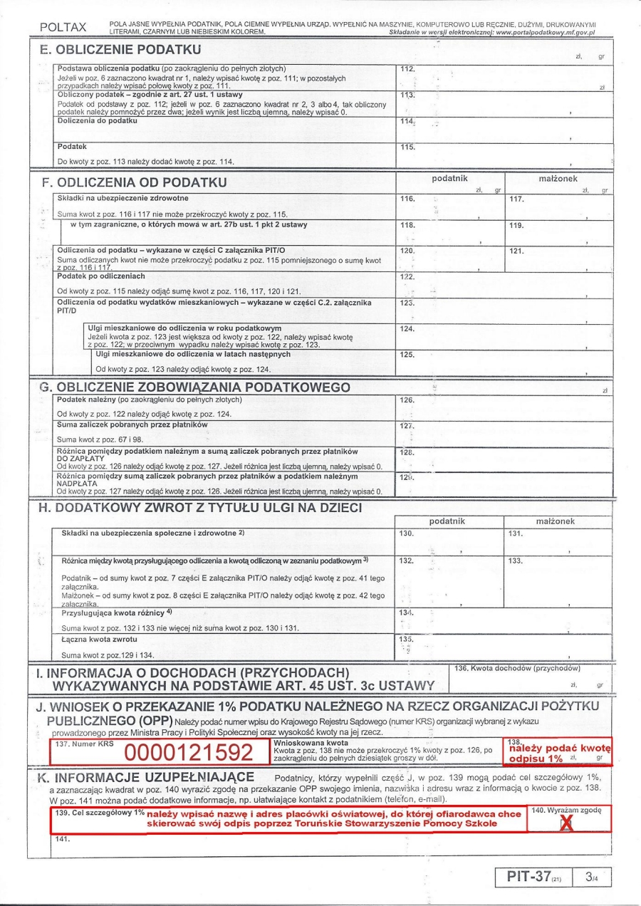 Jak co roku zachęcamy wszystkich Państwa do przekazania 1% swojego podatku na rzecz naszej szkoły. Można to uczynić poprzez odpowiednie wypełnienie zeznania podatkowego PIT 37 i wskazanie w nim Toruńskiego Stowarzyszenia Pomocy Szkole (KRS 0000121592) jako odbiorcy odpisu. Szczegółowe informacje zawiera zamieszczona poniżej ulotka.