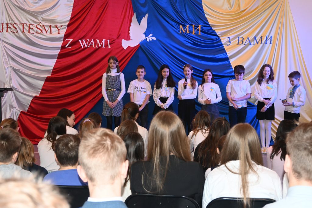 W podniosłej i jednocześnie pełnej serdeczności atmosferze dzieci z Ukrainy odśpiewali hymn państwowy, a po nim połączeni we wspólnym manifeście o Pokój na Świecie, uczniowie polscy i ukraińscy wyrecytowali wiersz pt. ”Drzewo pokoju”, będący dziecięcym wyrazem sprzeciwu wobec wojny.