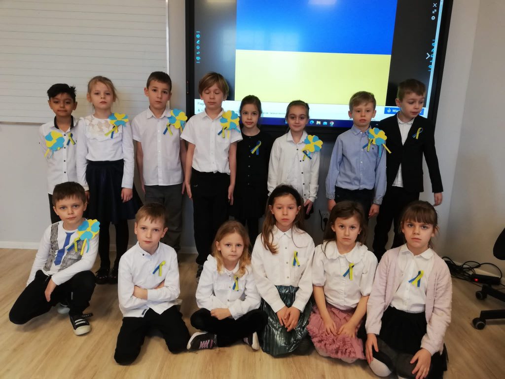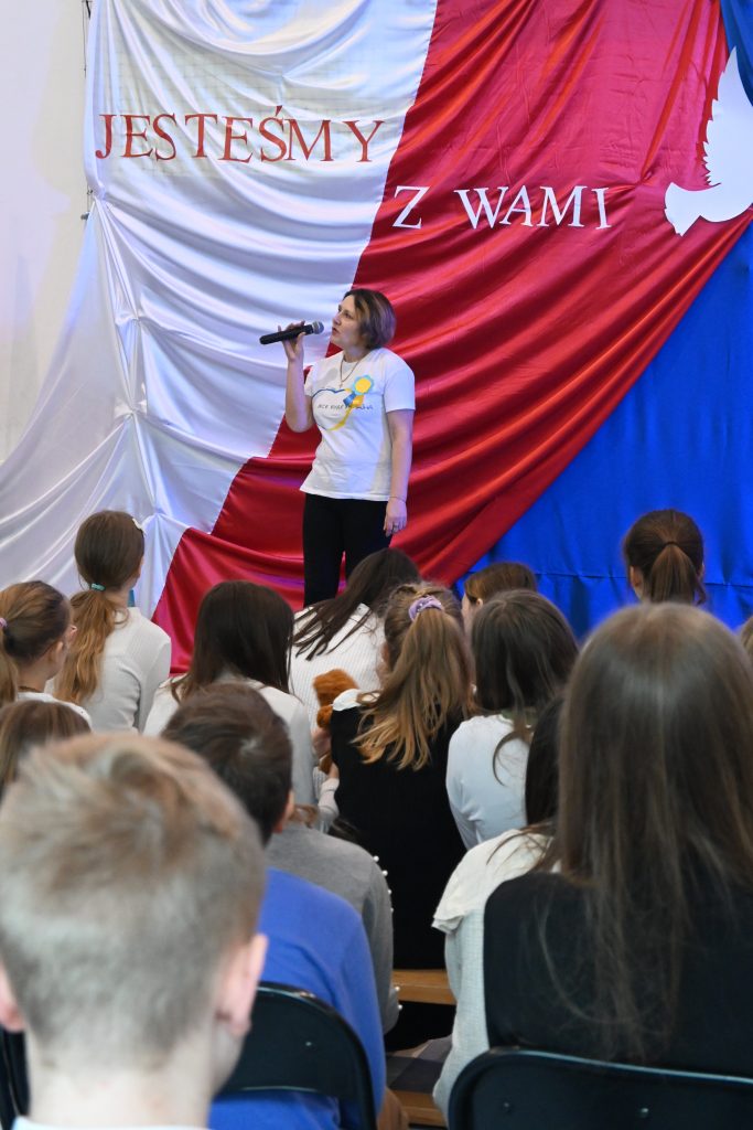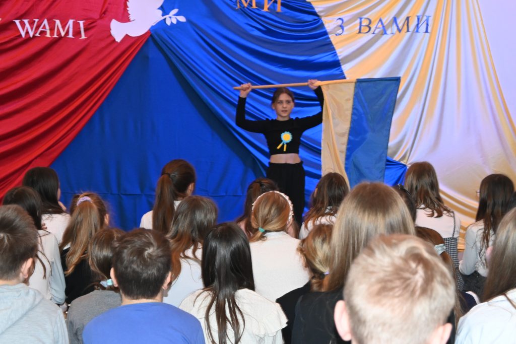 W rytm melodii „Mamo tyś płakała” zespołu Sanah zaprezentowała się uczennica klasy V Maja Brudnoch wykonując ujmujący za serca taniec z flagą Ukrainy. Akcentem kończącym apel była przejmująca pieśń patriotyczna w wykonaniu Valentiny Zhurba, która po wybuchu wojny znalazła schronienie i pracę w naszej szkole.