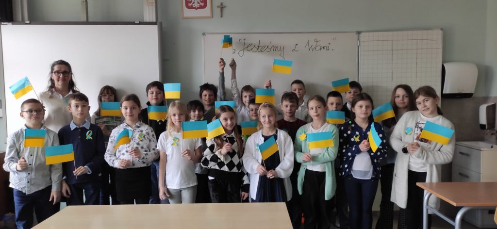 W rocznicę wybuchu wojny na Ukrainie- 24 lutego społeczność Szkoły Podstawowej im. ks. J. Twardowskiego w Przyłękach uczestniczyła w Apelu manifestującym pokój na świecie i wsparcie dla obywateli Ukrainy.