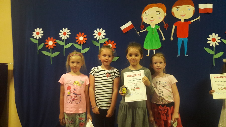 Dziewczynki z grupy „0” wzięły udział w gminnym konkursie plastycznym, organizowanym przez Przedszkole „Wróżka” pt. „Przedszkolak Polak – mały”. 16 .05 nastąpiło rozstrzygnięcie konkursu i wręczenie nagród.