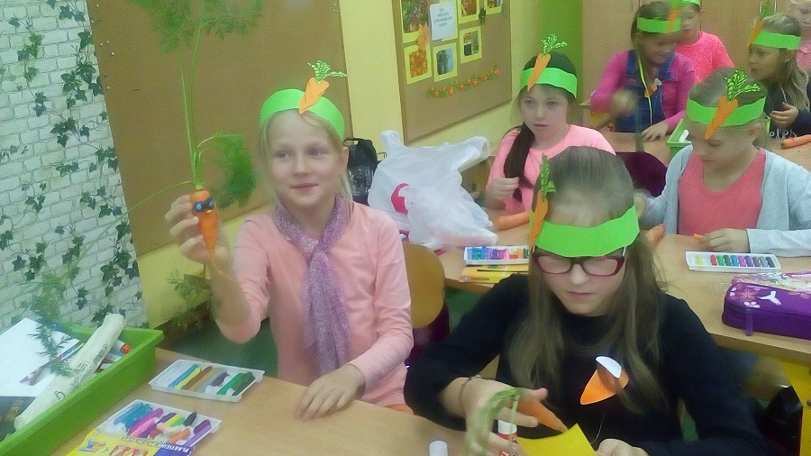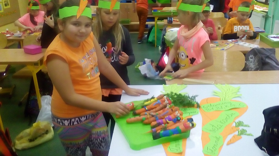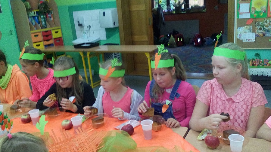 W dniach 3-6 października obchodziliśmy w szkole ŚWIĘTO OWOCÓW I WARZYW. Ogłoszony został konkurs na cudaka owocowo-warzywniaka, a w starszych klasach na wykonanie plakatu promującego zdrowe odżywianie. W czasie tego tygodnia promowano wartości odżywcze, które dostarczają nam owoce i warzywa. Każdy dzień zwracał uwagę na inny smakołyk i tak: poniedziałek był dniem marchewki, wtorek to dzień jabłka, środa była świętem sałatek owocowych i warzywnych, czwartek zaś dniem podsumowania działań oraz świętem pieczonego ziemniaka. W tych dniach uczniowie na drugie śniadanie przynosili dany owoc lub warzywo oraz ubierali się zgodnie z ich kolorem. Ten czas uatrakcyjniły także piękne dekoracje w klasach. W trakcie całej akcji uczniowie przypominali sobie jak ważne dla naszego zdrowia są witaminy dostarczane do naszego organizmu poprzez spożywanie owoców i warzyw. W czwartek jako podsumowanie każda klasa upiekła ziemniaki. Rozdano również nagrody i wyróżnienia w obydwu konkursach. Wszystkie prace były pomysłowe i wymagały ogromnej pracy.