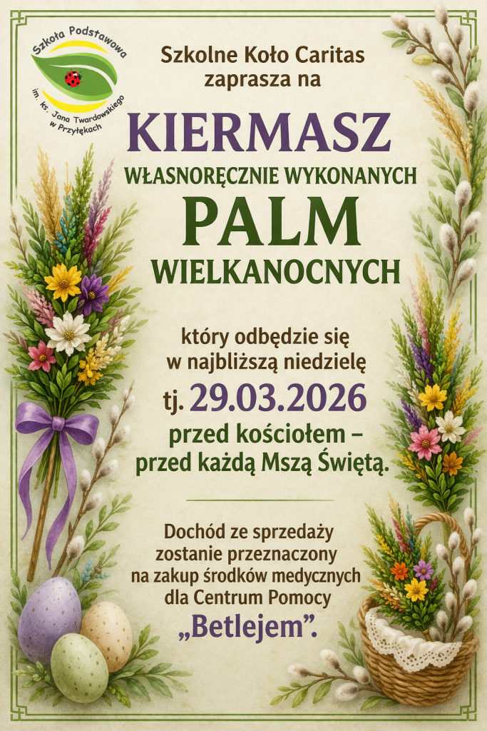 Szkolne Koło Caritas zaprasza na kiermasz własnoręcznie wykonanych palm wielkanocnych, który odbędzie się w najbliższą niedziele tj. 29.03.2026 przed Kościołem – przed każdą Mszą Świętą. Dochód ze sprzedaży zostanie przeznaczony na zakup środków medycznych dla Centrum Pomocy „Betlejem”.