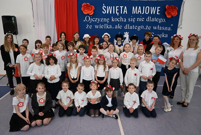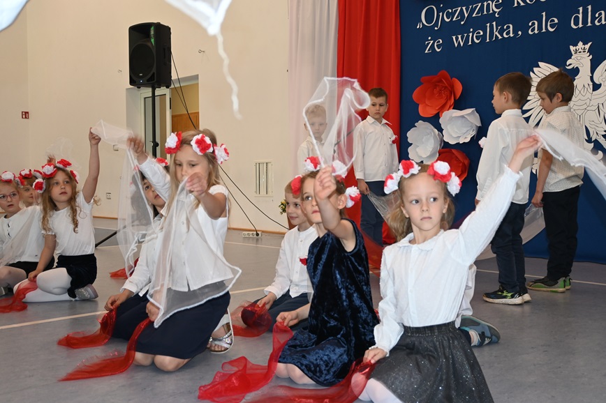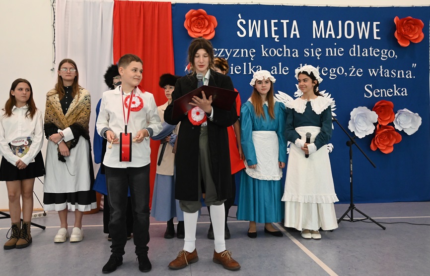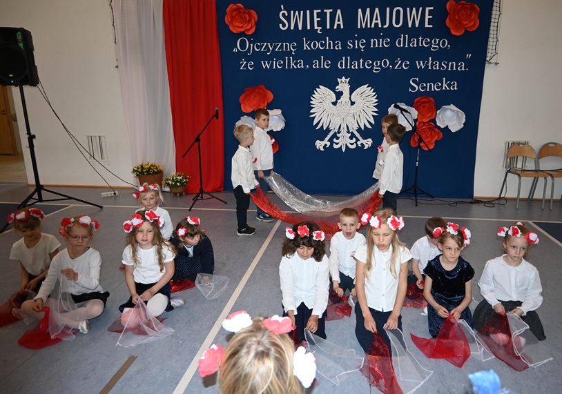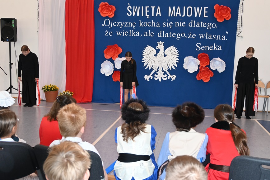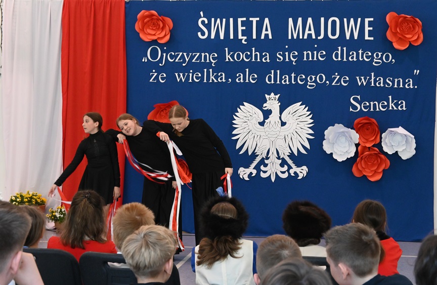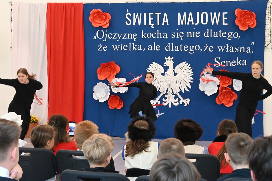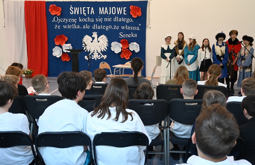 Cała społeczność uczniowska, nauczyciele oraz inni pracownicy szkoły zgromadzili się w pięknie przystrojonej sali gimnastycznej, by uczcić majowe święta. Zobaczyliśmy inscenizację przygotowaną przez uczniów klasy 6 pod kierunkiem pani Anny Barbachen oraz wysłuchaliśmy piosenek w wykonaniu klasy 3a oraz klas pierwszych. Nasi najmłodsi z oddziału przedszkolnego zatańczyli swój patriotyczny taniec, a na zakończenie zobaczyliśmy taniec uczennic z klasy 7 i 6.