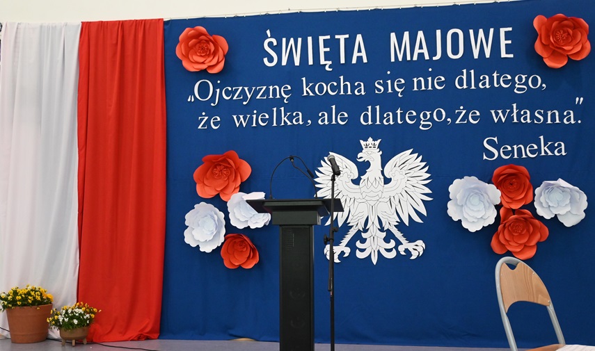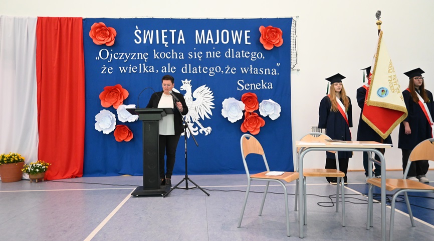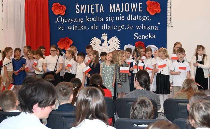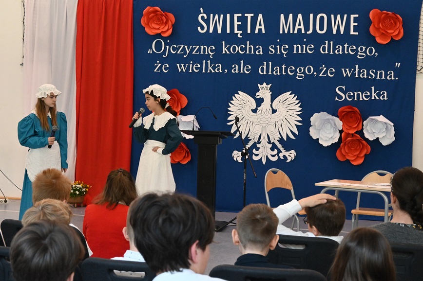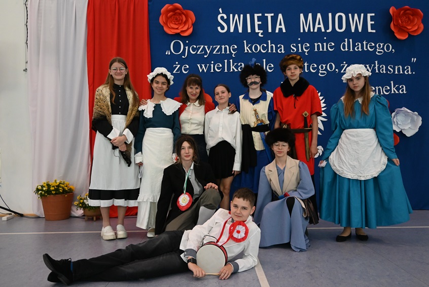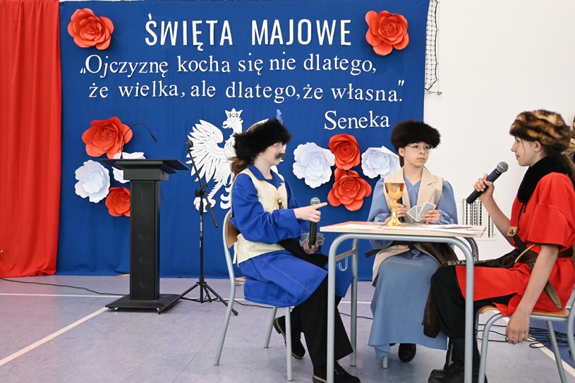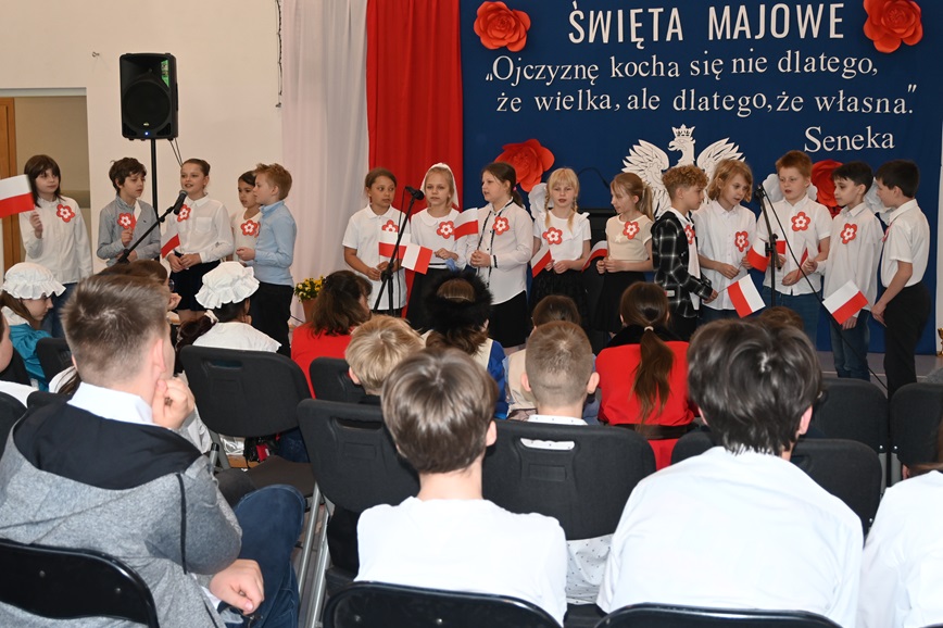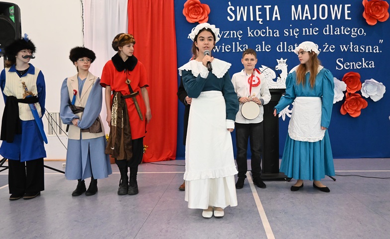 Cała społeczność uczniowska, nauczyciele oraz inni pracownicy szkoły zgromadzili się w pięknie przystrojonej sali gimnastycznej, by uczcić majowe święta. Zobaczyliśmy inscenizację przygotowaną przez uczniów klasy 6 pod kierunkiem pani Anny Barbachen oraz wysłuchaliśmy piosenek w wykonaniu klasy 3a oraz klas pierwszych. Nasi najmłodsi z oddziału przedszkolnego zatańczyli swój patriotyczny taniec, a na zakończenie zobaczyliśmy taniec uczennic z klasy 7 i 6.