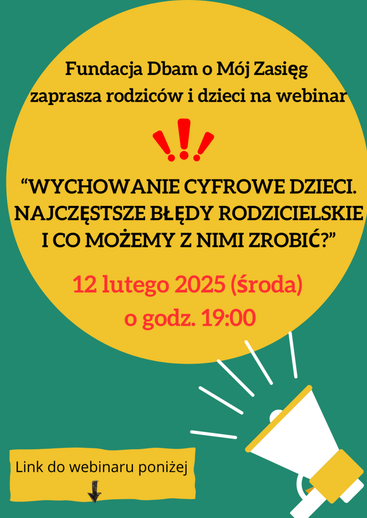 - Fundacja Dbam o Mój Zasięg zaprasza wszystkich rodziców na 12 lutego 2025 (środa) na godzinę 19:00, webinar odbywa się na platformie ClickMeeting pod linkiem: