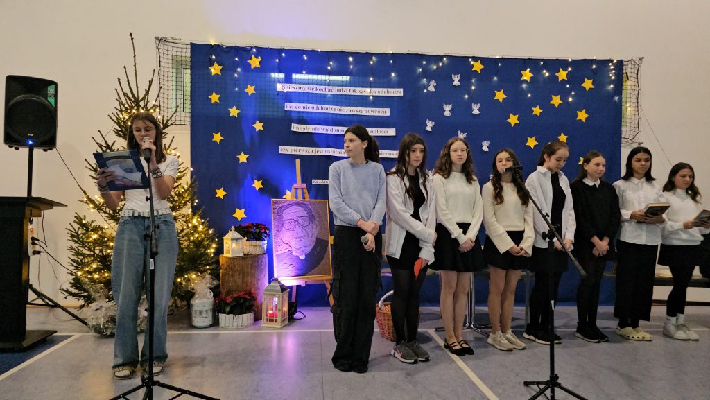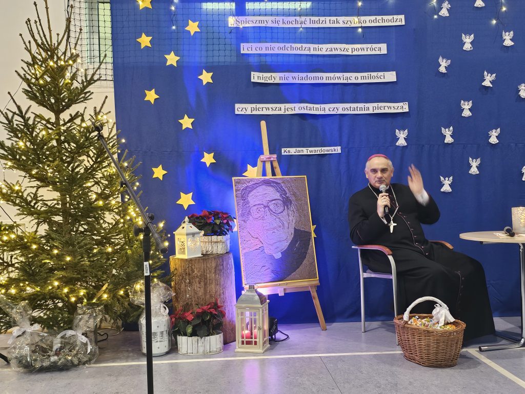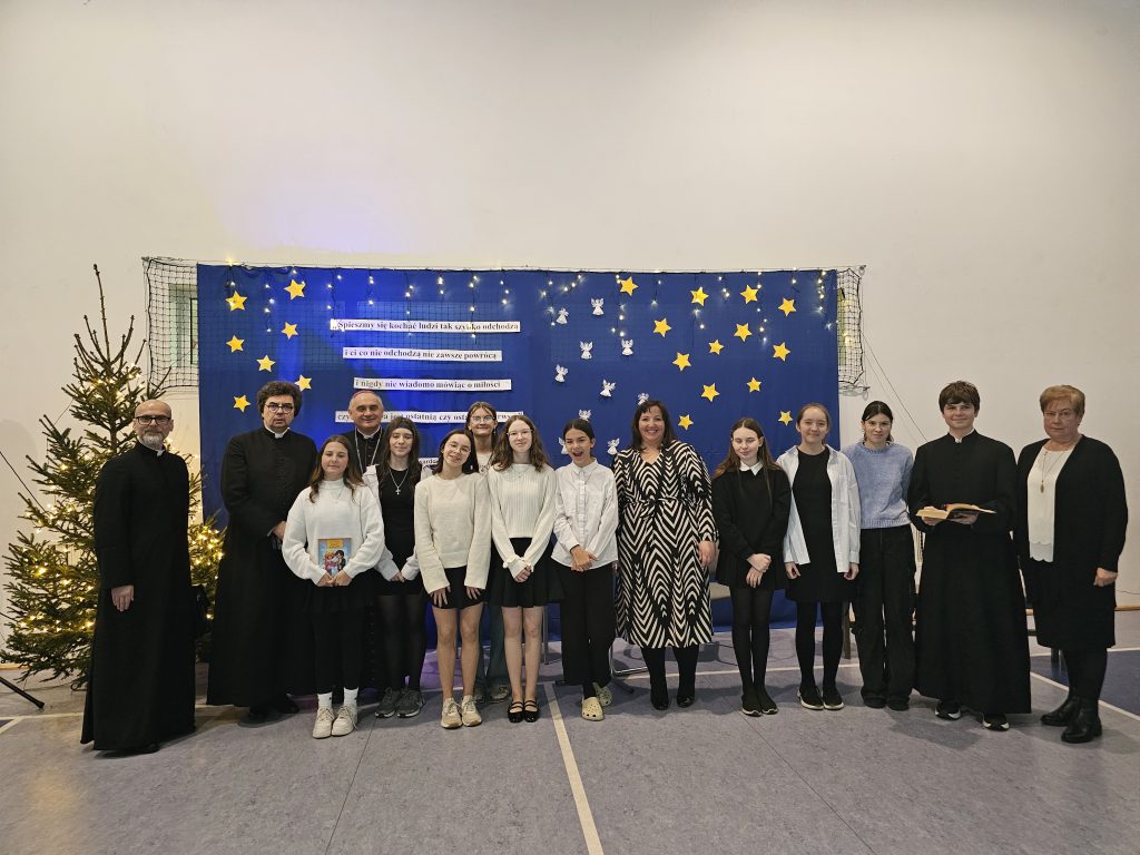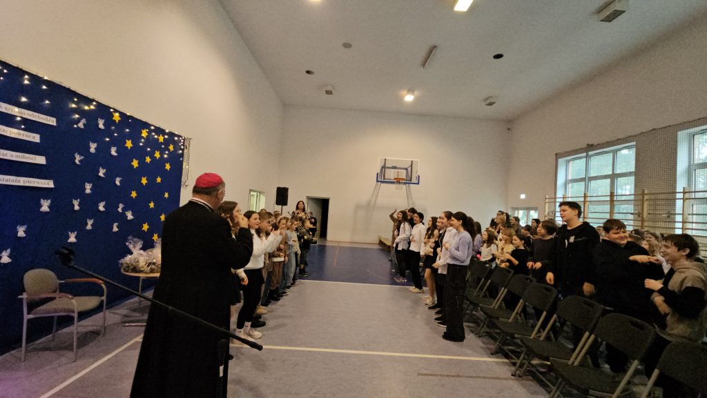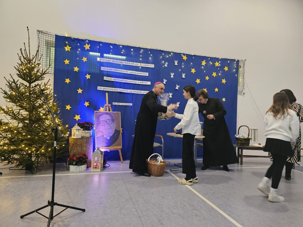 Wizyta rozpoczęła się od serdecznego powitania Księdza Biskupa przez Panią Dyrektor, która wyraziła wdzięczność za poświęcony czas i chęć odwiedzenia naszej szkoły. W podniosłej atmosferze uczniowie z koła teatralnego zaprezentowali specjalnie przygotowany program artystyczny, który miał na celu uczczenie tej szczególnej wizyty. W ramach występu uczniowie recytowali wiersze oraz śpiewali pieśni z tekstami autorstwa księdza Jana Twardowskiego – patrona naszej szkoły. Jego słowa, pełne ciepła i refleksji, idealnie wprowadziły zgromadzonych w nastrój zadumy nad życiem, wiarą i miłością. Młodzi artyści z wielkim zaangażowaniem przedstawili utwory, które na co dzień inspirują nas do otwartości na drugiego człowieka i pogłębiania więzi z Bogiem i otaczającą nas przyrodą.