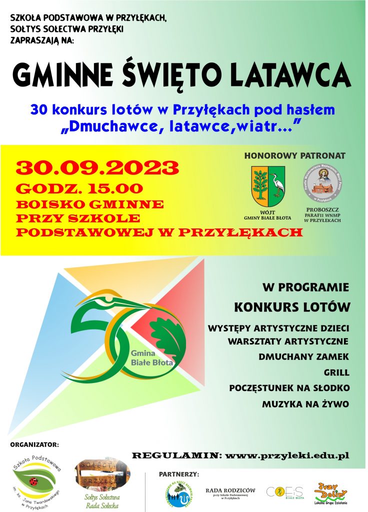 Szkoła Podstawowa im. ks. Jana Twardowskiego w Przyłękach serdecznie zaprasza uczniów Szkół Podstawowych z terenu Gminy Białe Błota do udziału w GMINNYM ŚWIĘCIE LATAWCA, które odbędzie się 30 września 2023 r. o godz. 15.00