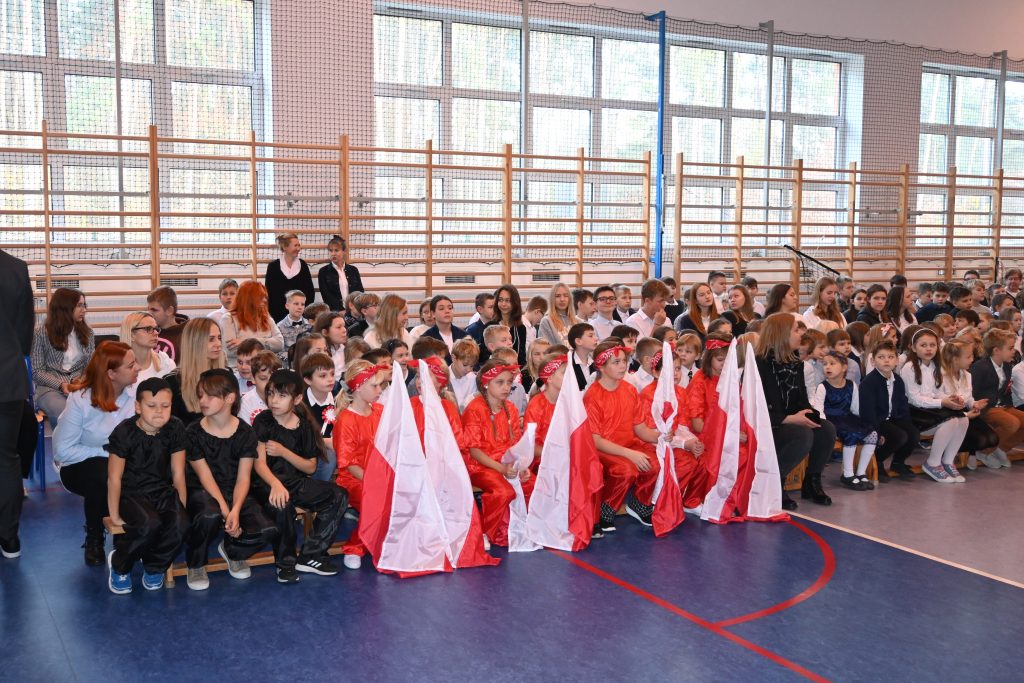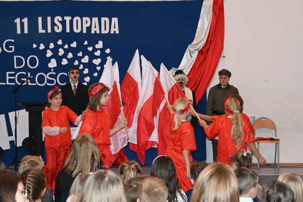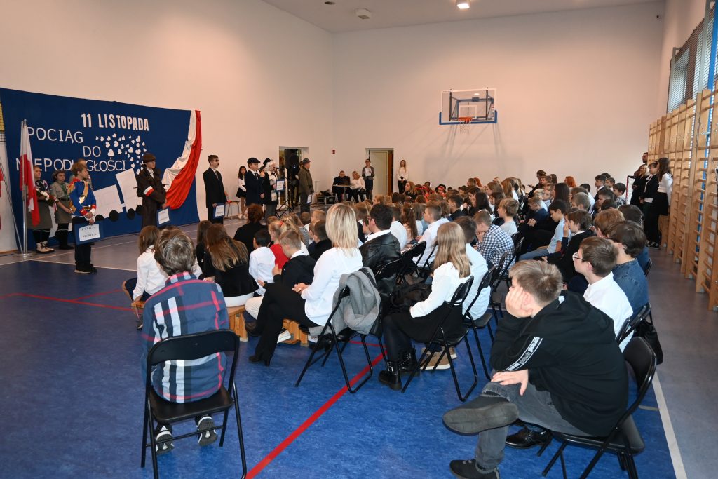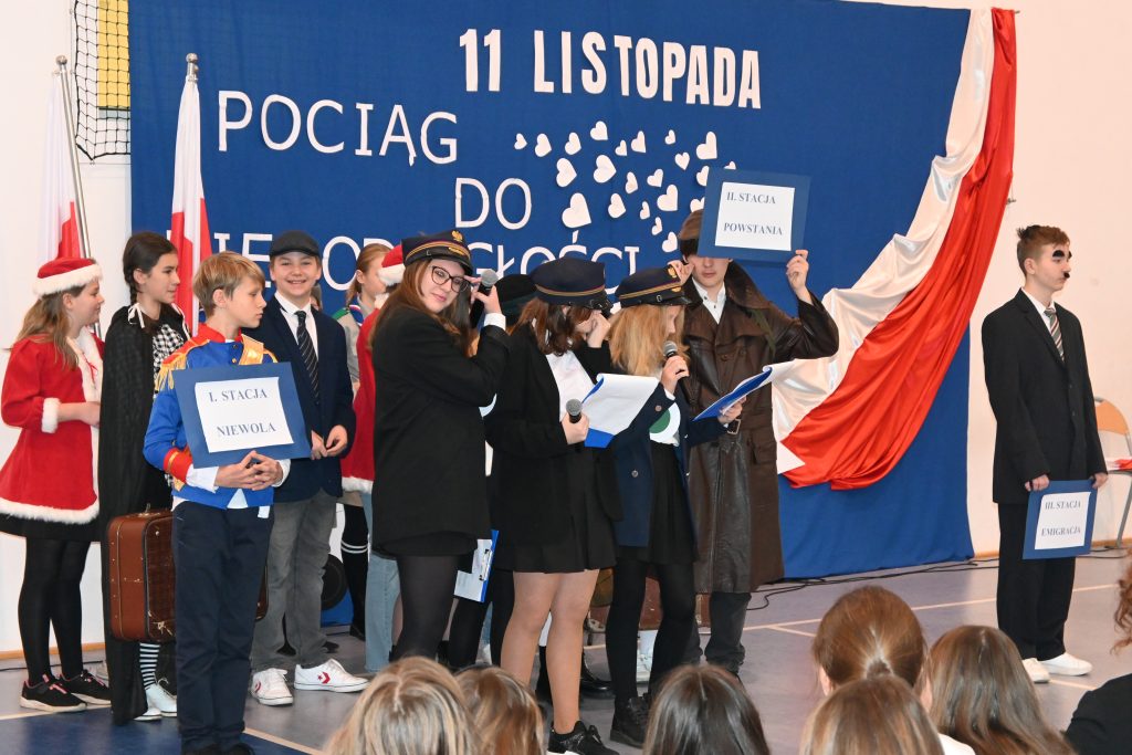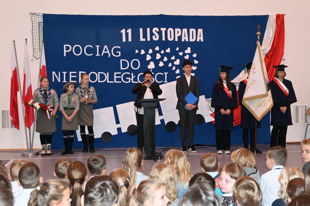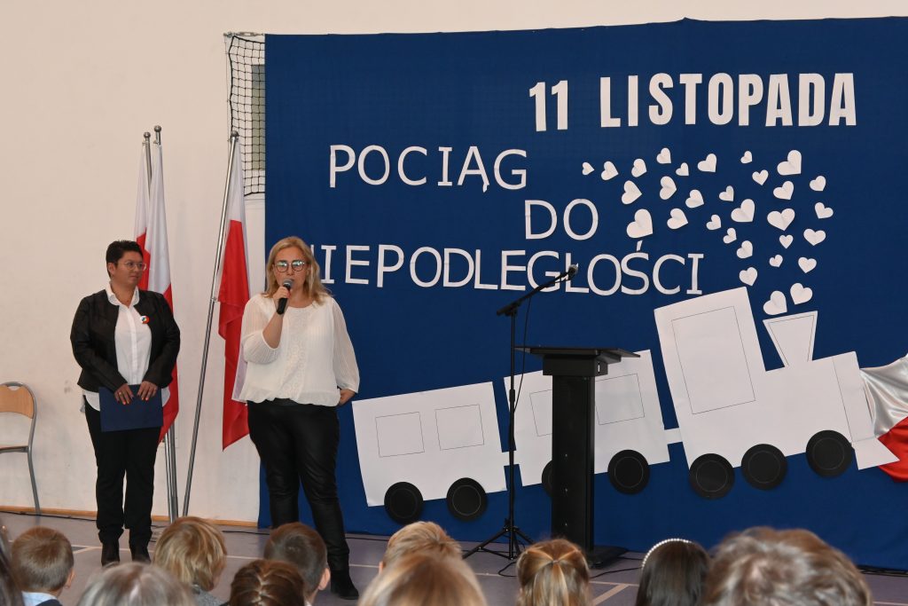 10 listopada 2022 roku społeczność naszej szkoły uroczyście świętowała Dzień Niepodległości. Wszyscy uczniowie, pani Karolina Lachowicz – Przewodnicząca Komisji Oświaty, Kultury, Zdrowia, Pomocy Społecznej i Sportu, Rodzice, Dyrekcja, Pracownicy i Nauczyciele z uwagą obejrzeli spektakl słowno-muzyczny pt. „Pociąg do wolności”. Zebrani z zadumą uczestniczyli z aktorami w podróży przez 123 lata niewoli aż do odzyskania upragnionej wolności. Na kolejnych stacjach: Niewola, Powstania, Emigracja, I wojna światowa, Wolność wysłuchaliśmy najpiękniejszych strof polskiej poezji, pieśni patriotycznych w wykonaniu chóru, obejrzeliśmy taniec klasy 3. Laura, Lena i Maja na koniec zaprezentowały utwór M. Rodowicz „Ty to masz szczęście, że w tym momencie żyć ci przyszło w kraju nad Wisłą” i takie było przesłanie tegorocznych obchodów: cieszmy się, że żyjemy we własnym kraju, mówimy po polsku, panuje pokój, który, jak widać na przykładzie Ukrainy, wcale nie jest nam dany raz na zawsze i bywa niezwykle kruchy.