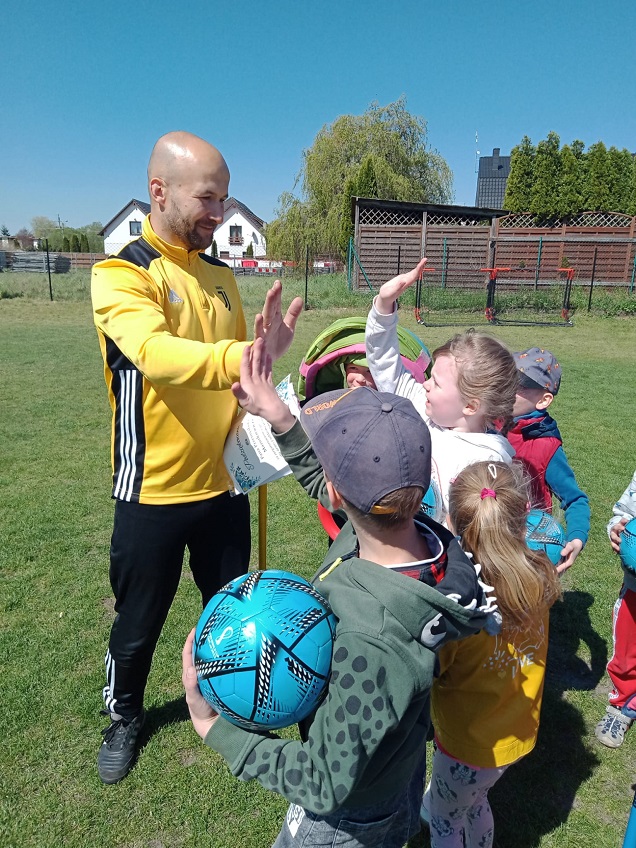 Pan Przemek, na co dzień czynnie działający w Juventus Academy Bydgoszcz, wykazał się niezwykłym talentem trenerskim. Przygotowane przez niego aktywności wywołały u dzieci wielki entuzjazm. Przedszkolaki uważnie słuchały poleceń trenera i chętnie uczestniczyły we wszystkich zadaniach. Oprócz indywidualnych ćwiczeń, nie zabrakło także rywalizacji drużynowych. Na koniec odbyły się mini mecze piłki nożnej. Był to wspaniały trening i niezwykłe spotkanie, które z pewnością na długo pozostanie w pamięci przedszkolaków.