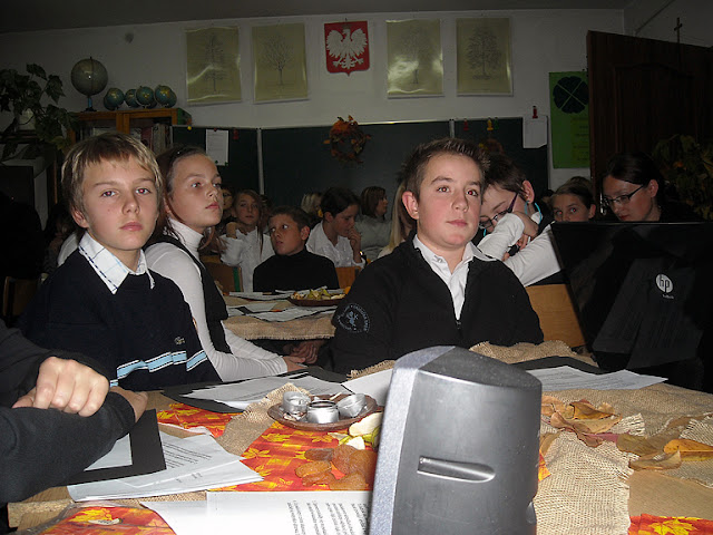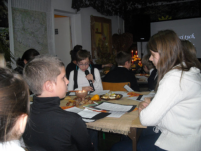 W jesiennej scenografii: wśród liści, w blasku palących się zniczy i świec – w atmosferze dużego skupienia i serdeczności, prezentacji literacko – muzycznej wysłuchali rodzice młodych artystów, a także zaproszeni goście.