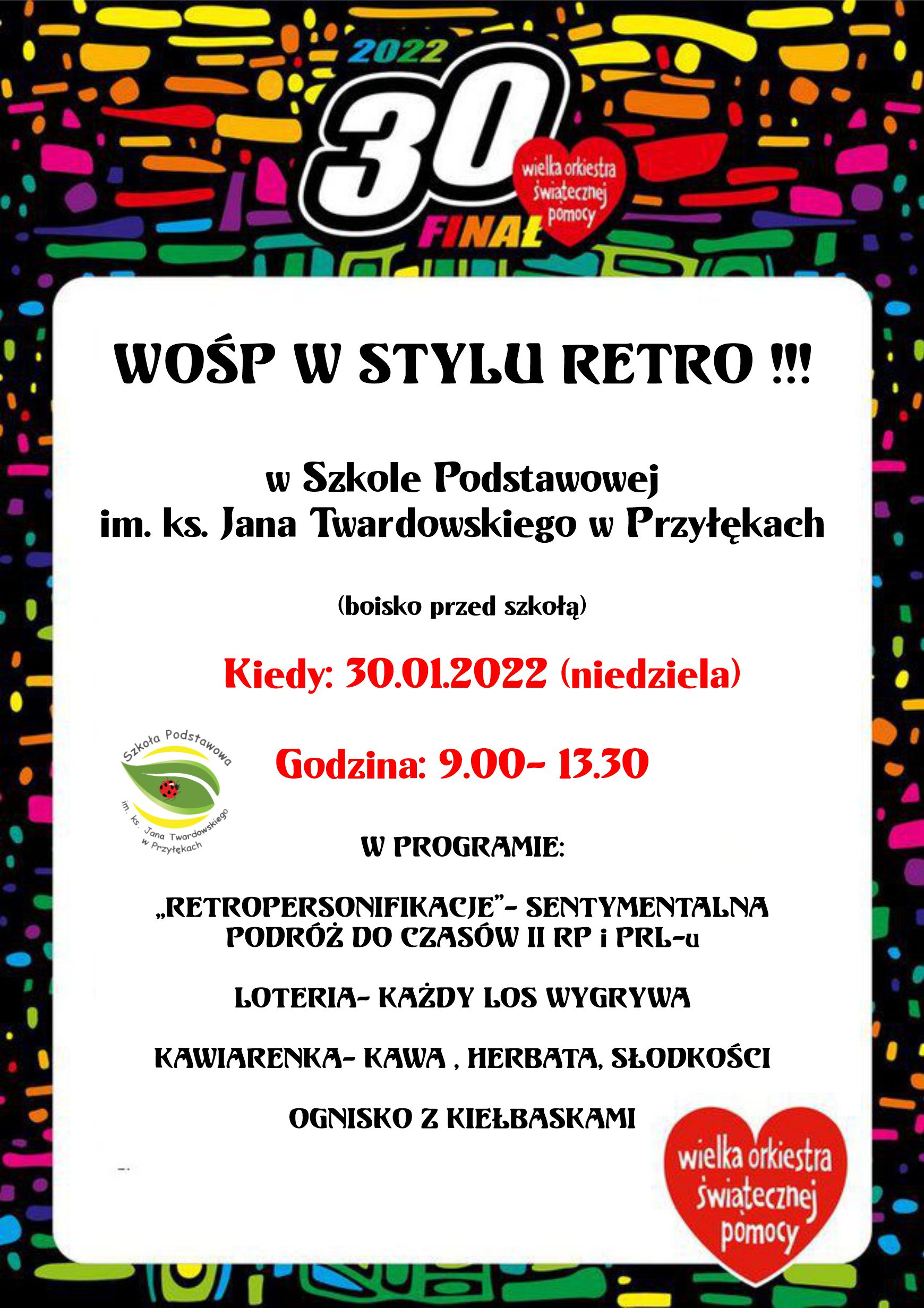 WOŚP W STYLU RETRO !!! w Szkole Podstawowej im. ks. Jana Twardowskiego w Przyłękach (boisko przed szkołą) Kiedy: 30.01.2022 (niedziela) Godzina: 9.00- 13.30 W PROGRAMIE: „RETROPERSONIFIKACJE” – SENTYMENTALNA PODRÓŻ DO CZASÓW II RP i PRL-u LOTERIA- KAŻDY LOS WYGRYWA KAWIARENKA- KAWA , HERBATA, SŁODKOŚCI OGNISKO Z KIEŁBASKAMI O godz. 11.30 na boisku szkolnym “zaparkuje” również …