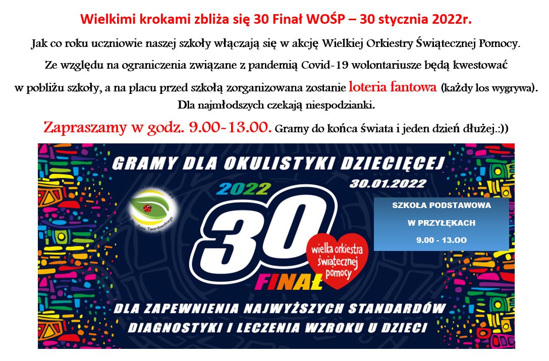 Wielkimi krokami zbliża się 30 Finał WOŚP – 30 stycznia 2022r. Jak co roku uczniowie naszej szkoły włączają się w akcję Wielkiej Orkiestry Świątecznej Pomocy. Ze względu na ograniczenia związane z pandemią Covid-19 wolontariusze będą kwestować w pobliżu szkoły, a na placu przed szkołą zorganizowana zostanie loteria fantowa (każdy los wygrywa). Dla najmłodszych czekają niespodzianki. …