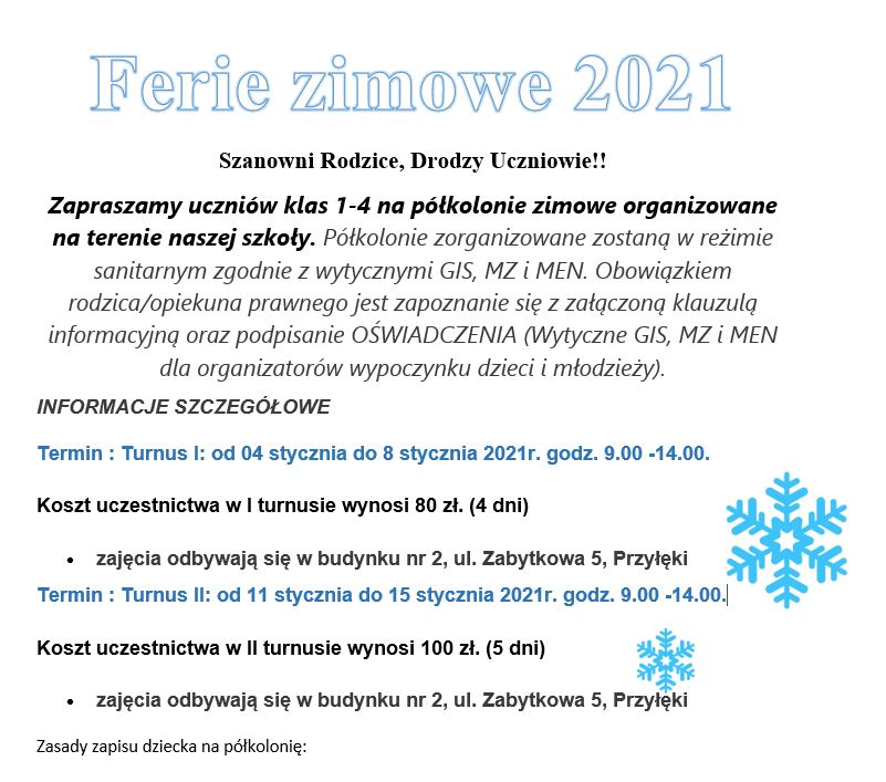 Szanowni Rodzice, Drodzy Uczniowie!! Zapraszamy uczniów klas 1-4 na półkolonie zimowe organizowane na terenie naszej szkoły. Półkolonie zorganizowane zostaną w reżimie sanitarnym zgodnie z wytycznymi GIS, MZ i MEN. Obowiązkiem rodzica/opiekuna prawnego jest zapoznanie się z załączoną klauzulą informacyjną oraz podpisanie OŚWIADCZENIA (Wytyczne GIS, MZ i MEN dla organizatorów wypoczynku dzieci i młodzieży). INFORMACJE SZCZEGÓŁOWE Termin …