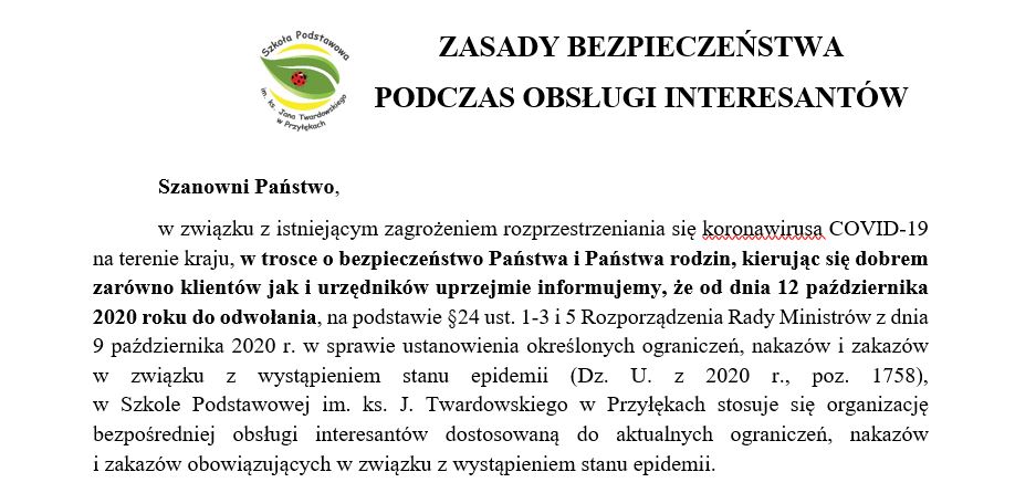 ZASADY BEZPIECZEŃSTWA PODCZAS OBSŁUGI INTERESANTÓW Szanowni Państwo, w związku z istniejącym zagrożeniem rozprzestrzeniania się koronawirusa COVID-19na terenie kraju, w trosce o bezpieczeństwo Państwa i Państwa rodzin, kierując się dobrem zarówno klientów jak i urzędników uprzejmie informujemy, że od dnia 12 października 2020 roku do odwołania, na podstawie §24 ust. 1-3 i 5 Rozporządzenia Rady Ministrów …
