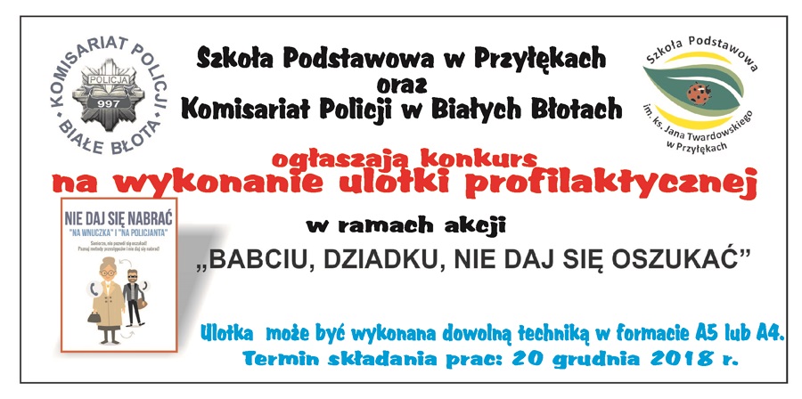 Zapraszamy do udziału w konkursie wszystkich uczniów naszej szkoły. Regulamin znajduje się poniżej. Regulamin konkursu profilaktycznego na wykonanie ulotki profilaktycznej pt.: „ Babciu, dziadku, nie daj się oszukać” 1. Organizator konkursu: Konkurs organizowany jest przez Szkołę Podstawową w Przyłękach oraz Komisariat Policji w Białych Błotach. 2. Cel konkursu: Prowadzenie działań związanych z profilaktyką związaną z …